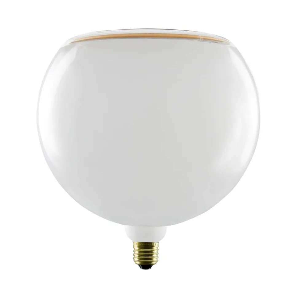 E27 LED lamp Floating, Ø 20 cm, 6 W, witte glazen bol Deze LED lamp uit de Floating serie is voorzien van een witte glazen bol in een grote G200 bolvorm, die aan de andere kant dan de voet open is. De diodes zijn geïntegreerd in de ringvormige opening. De metalen E27 voet heeft een gouden afwerking en de gepatenteerde soft filament technologie en aantrekkelijke lichtreflecties geven de lamp extra decoratieve waarde. Ideaal voor open armaturen zonder kap of lamphouderarmaturen – extern dimbaar (trailing edge) – extra warmwit licht – goede kleurweergave (CRI 90) – handgemaakte glazen gloeilamp