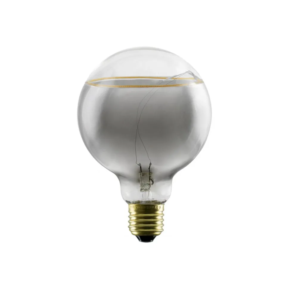 LED lamp Illusion Globe 95 E27 5 W, dimbaar Deze gesloten LED globe lamp Illusion van Segula maakt indruk met zijn ongewone uiterlijk, waardoor het een blikvanger is in elke lamphouder zonder kap. Het glas is rokerig grijs getint tot aan de LED gloeiring, terwijl het glas onder de gloeiring helder is. De glazen lamp straalt extra warm licht uit met een kleurtemperatuur van 2.200 K en wordt gekenmerkt door een bijzonder goede Ra90 kleurweergave. Een lange levensduur en een zeer goede geluidsbestendigheid zijn verdere voordelen van deze Illusion LED globe lamp.