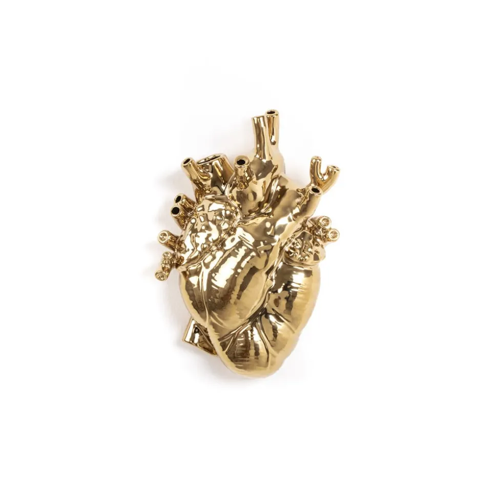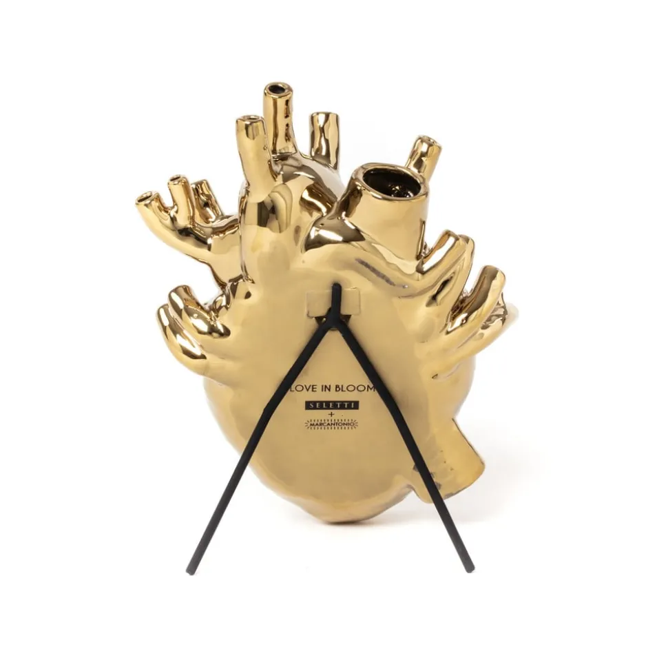 Plantenpot en sculptuur in één: goudkleurige Love in Bloom vaas van hoogwaardig porselein van SELETTI Love in Bloom is een hartvormige vaas die eruitziet alsof hij uit een essay over menselijke anatomie komt. Een moderne liefde vertaald in een romantisch maar onvoorspelbaar cadeau. Het is geen droom, het is liefde in bloei. Het is geen lente, het is liefde in bloei. Inclusief standaard en geschenkdoos.