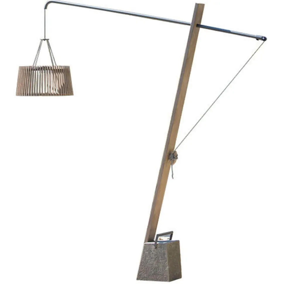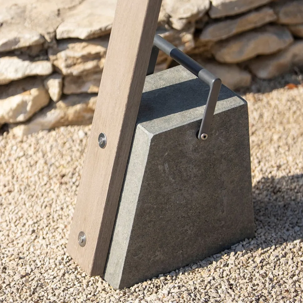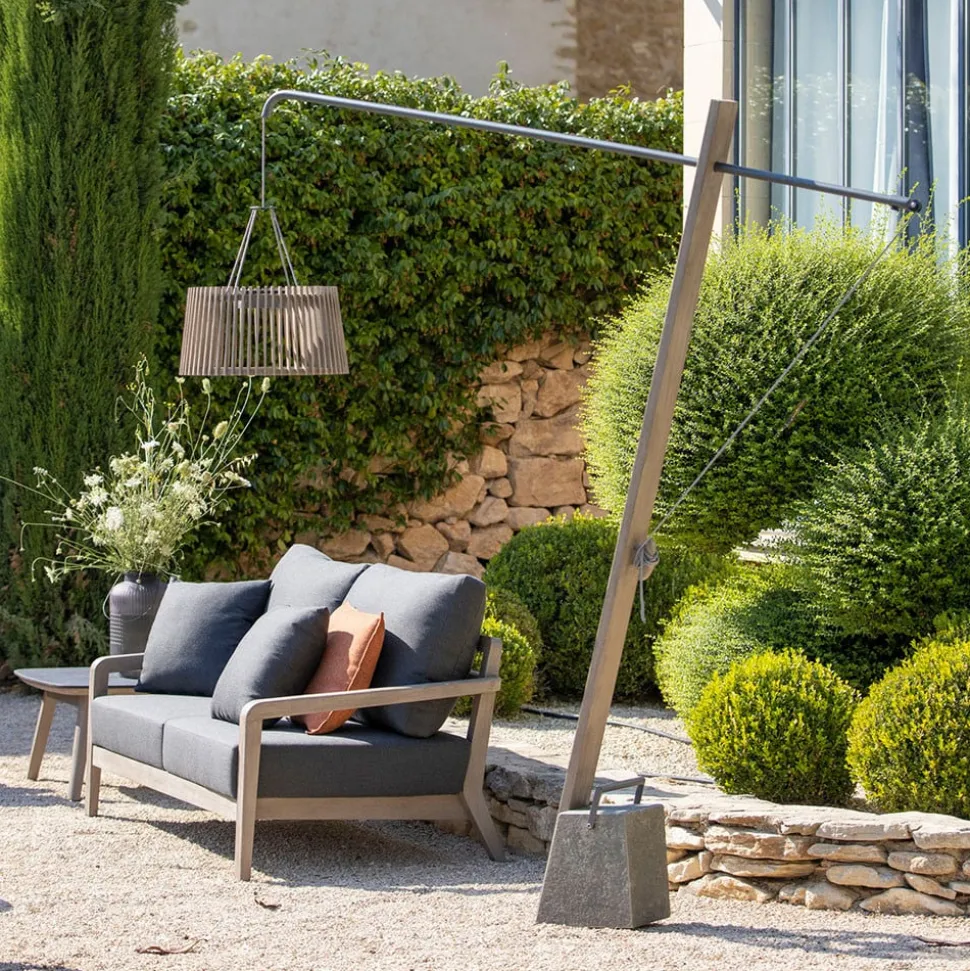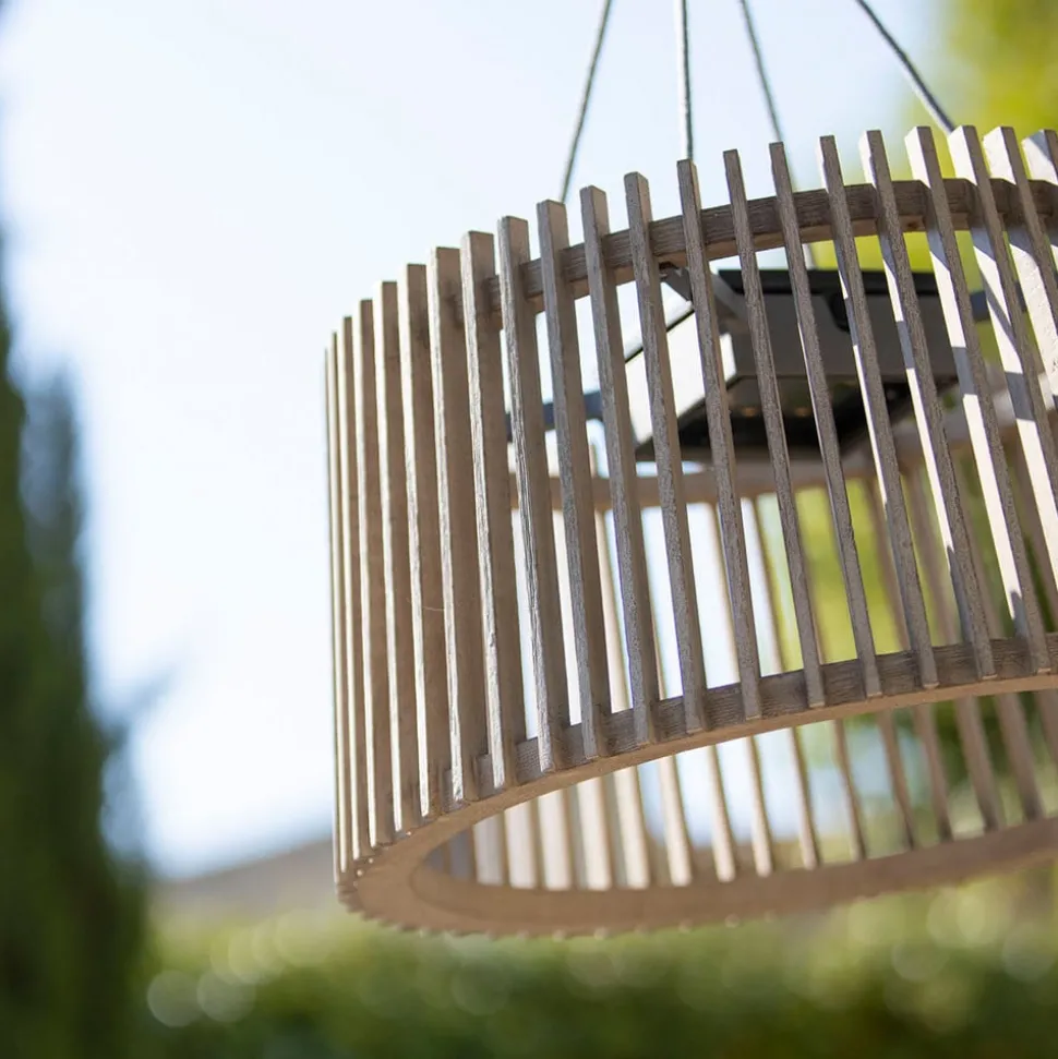 Skaal patio vloerlamp met LED lichtbron – op zonne-energie Die LED vloerlamp op zonne-energie is een visueel en functioneel HighLight voor elk terras. Dankzij haar brede projectie kan ze een tafel verlichten zonder in de weg te zitten. De lamellenkap van teakhout laat het stralende licht in de omgeving ontsnappen. De voet is gemaakt van lavasteen en zorgt voor de nodige stabiliteit. Die krachtige LED verlichting is dimbaar. Er is al een bewegingsmelder geïnstalleerd zodat de verlichting wordt ingeschakeld zodra de sensor beweging detecteert. Duratek afwerking: Het teakhout is uiterst gemakkelijk te onderhouden. Het werd eerst krachtig geborsteld om een getextureerde afwerking te krijgen. Na een eerste laag waterbestendige grondverf werden er vijf lagen grijze afwerking aangebracht. Dit proces beschermt het hout tegen weersinvloeden, UV-stralen en verschillende vlekken zoals wijn, koffie of olie. Die grijze kleur onderstreept de hedendaagse Chic look. Onderhoud: niet oliën. Oplaadbaar via het geïntegreerde zonnepaneel of via USB-kabel van het lichtnet. Die brandt tussen 5 en 200 uur.