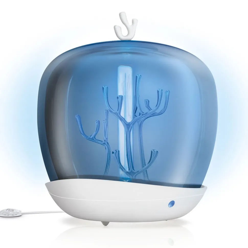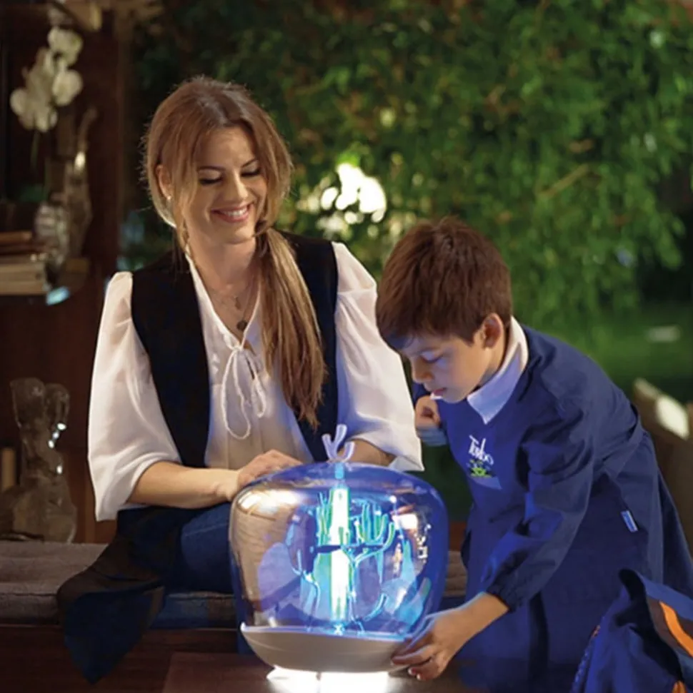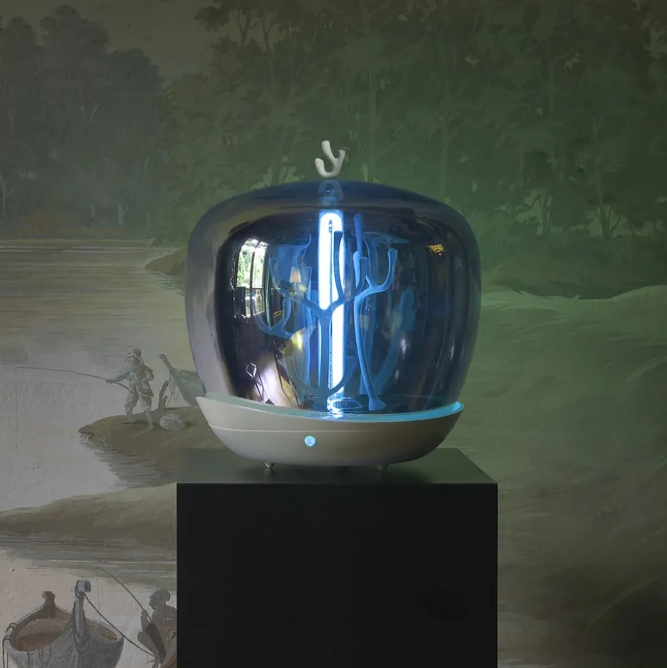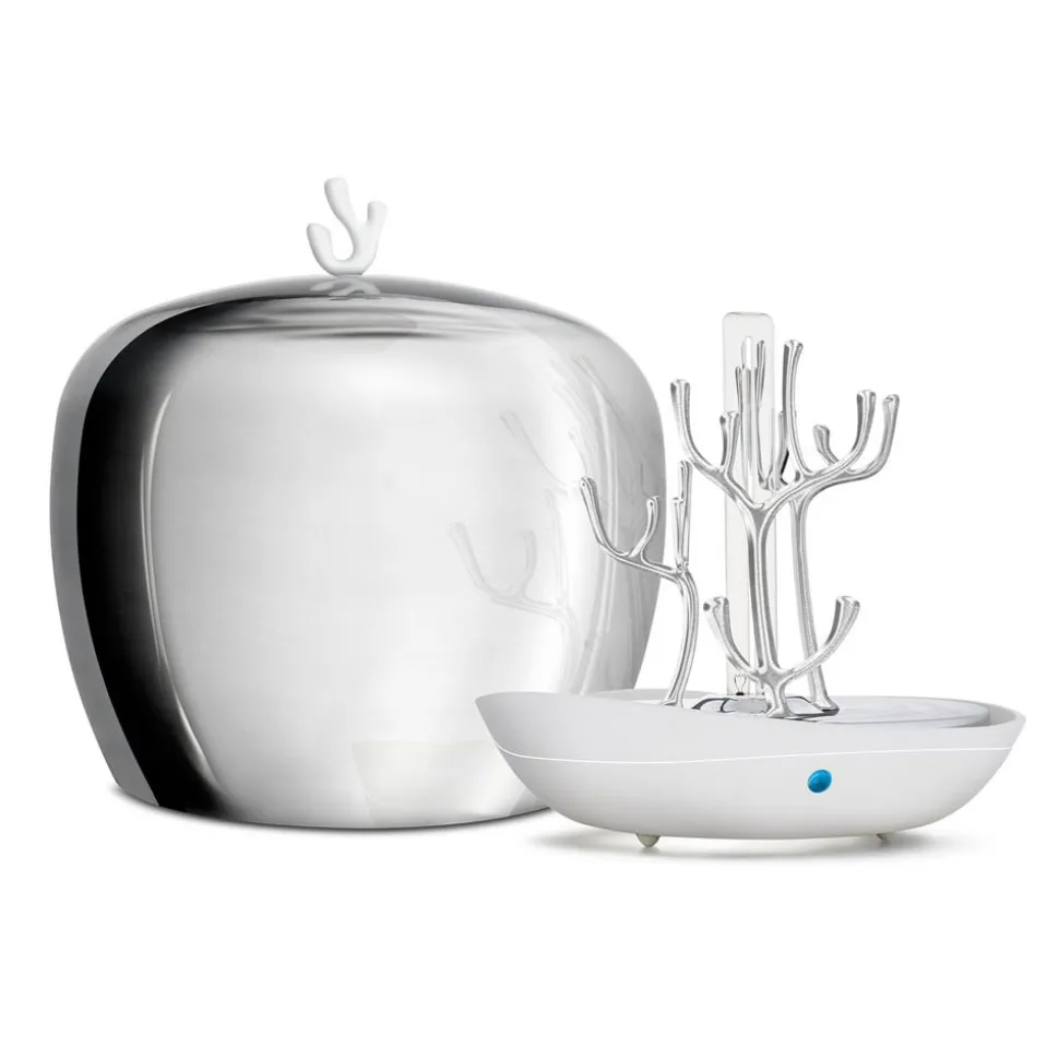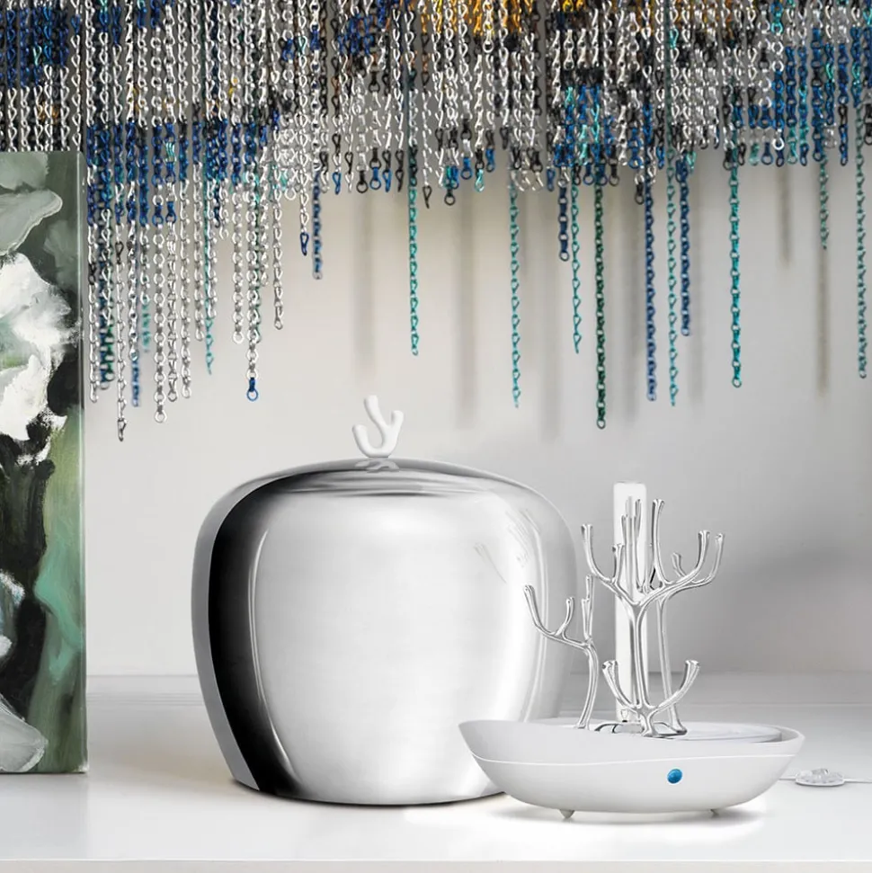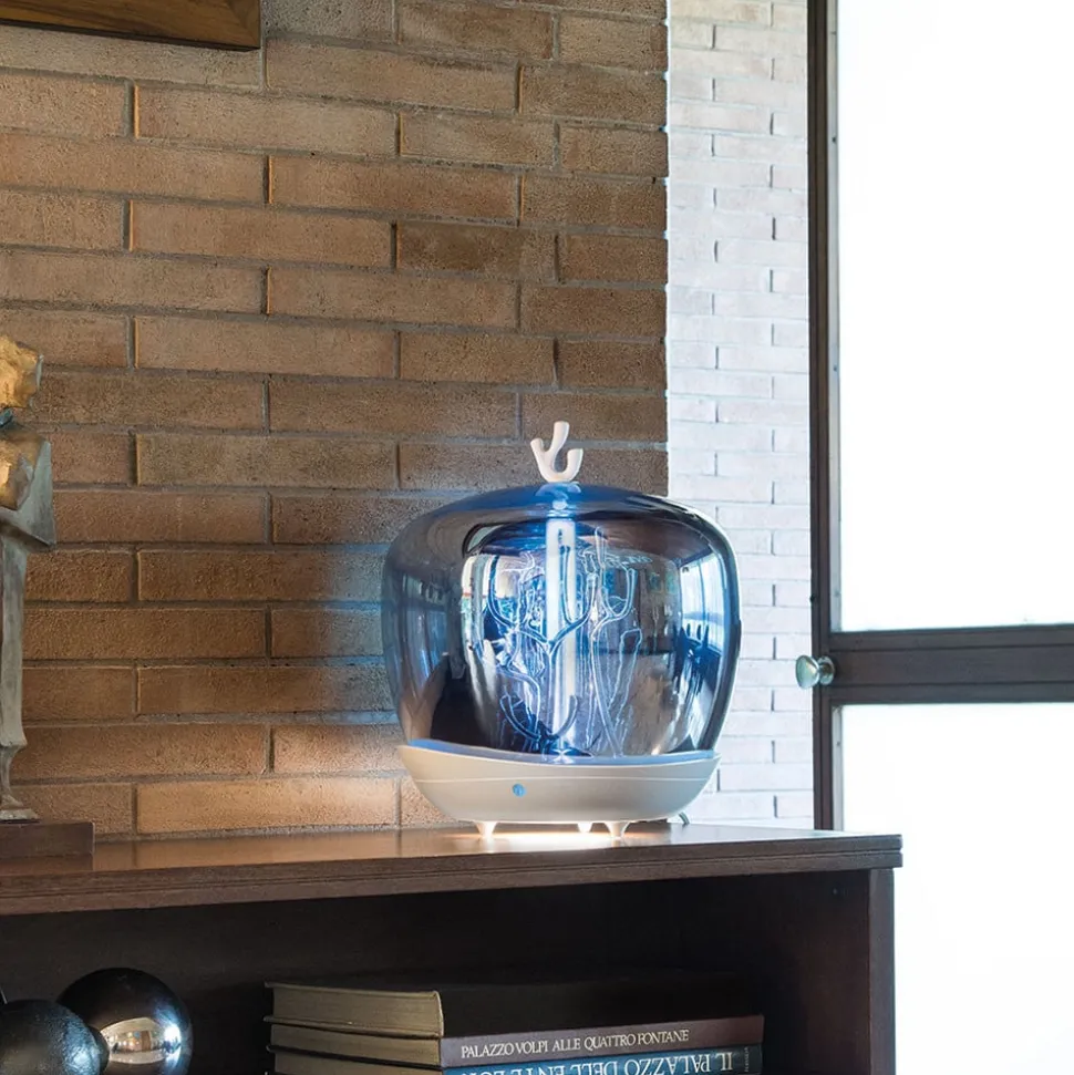 PurityCapsule – tafellamp en UV-C desinfectie gecombineerd Aan de buitenkant is PurityCapsule een modern accessoire. Een basis met een licht gebogen rand TRÄGT een bolvormige koepel met een gemetalliseerd oppervlak, die de kijker een hint geeft van de zilveren structuur Innes in de vorm van een koraal. De tafellamp heeft twee aparte lichtbronnen. Een G9 die onder de basis wordt geleverd, creëert een sfeervol licht op de basis van de lamp. Innes zit een buislamp van 2G7, die een buitengewone sfeer creëert met haar blauwachtige glinstering en de binnenkant van de koepel doet lijken op een wereld uit een andere dimensie. De buislamp geeft PurityCapsule niet alleen haar karakteristieke uiterlijk, maar desinfecteert ook oppervlakken met behulp van UVC-licht. Kleine alledaagse voorwerpen zoals sleutels, smartphones, portemonnees, brillen of sieraden kunnen tegen het Element worden geleund; binnen slechts 30 seconden worden 99,99% van de bacteriën en virussen op de oppervlakken onschadelijk gemaakt (wetenschappelijk bevestigd). Het risico op het doorgeven van besmettelijke ziekten zoals griep of verkoudheid via met ziektekiemen besmette voorwerpen kan daarom effectief worden verminderd met PurityCapsule. Omdat de coating van de koepel voorkomt dat schadelijke lichtcomponenten ontsnappen, kan de UV-C functie zonder aarzeling worden gebruikt wanneer er mensen aanwezig zijn. Mite zijn combinatie van aantrekkelijk design en praktische desinfectie van oppervlakken is PurityCapsule een eigentijds inrichtingsobject voor zowel Mod particuliere woningen als voor openbare/commerciële receptie- en loungeruimten.