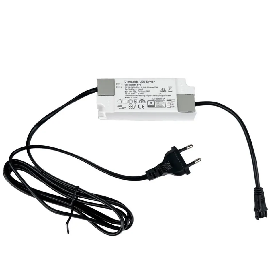 SLC LED-driver dimbaar 350 mA max. 14 W – dimbaar via fase-afsnijding en fase-afsnijdingsdimmer – primair 200 – 240 V – secundair 20 – 40 V 350 mA – met 2 m aansluitkabel met Eurostekker