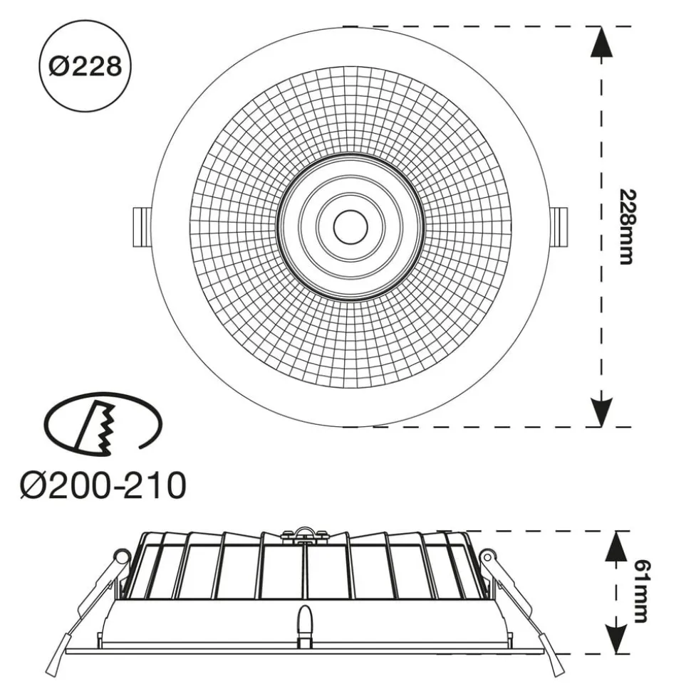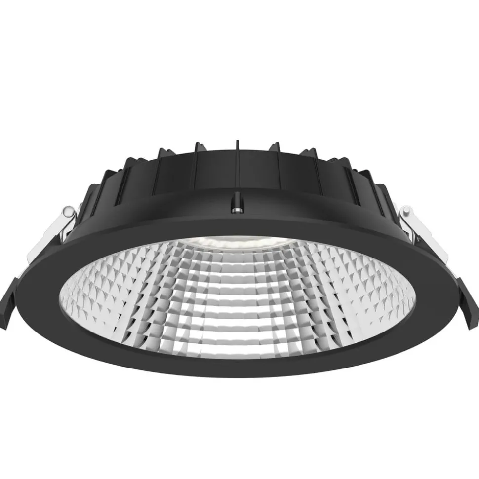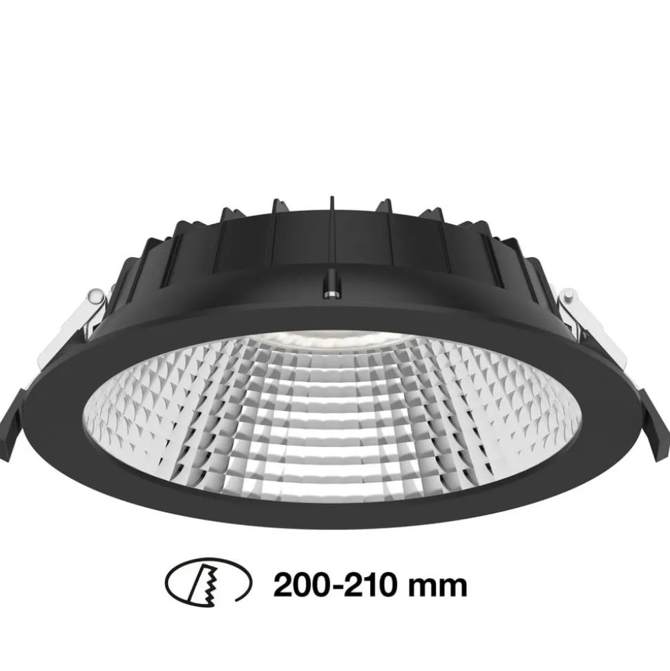 LED inbouwspot SLC Shift voor inbouwdiameters van 20 tot 21 cm Deze LED inbouwspot is ideaal voor ombouw, hij past in inbouwopeningen van 20 tot 21 cm. De zeer efficiënte downlight straalt flikkervrij licht uit en kan in lichtkleur worden aangepast (3.000 K of 4.000 K). Met een UGR <19 is hij ideaal voor het vervangen van oude armaturen in werkruimten, zoals kantoren. Met accessoires kan de armatuur ook als opbouwarmatuur worden gemonteerd of in grotere openingen worden gebruikt – LED-driver niet inbegrepen, moet apart worden besteld – 60° stralingshoek – met hoogspiegelende reflector – IP54-beschermingsgraad – nominale omgevingstemperatuur volgens IEC 62722-2-1: -20 tot 40° C – dimbaar met faseaansnijdings- en faseafsnijdingsdimmers