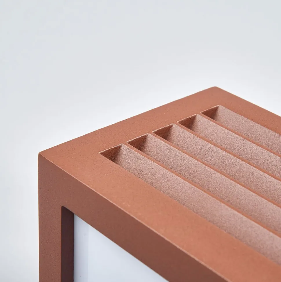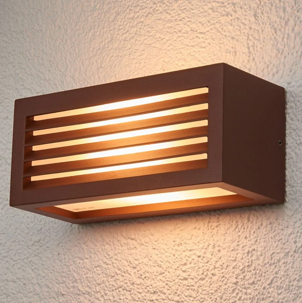 Roestbruine Box L buitenwandlamp – spot aan drie zijden Veelzijdig, modern en energiebesparend – de Box L wandlamp van aluminium in roestbruin past op bijna elke buitenwandlamp en straalt aan drie zijden licht uit. Aan de voorkant zorgen de bevestigde lamellen niet alleen voor een aantrekkelijke uitstraling, maar verzachten ze ook het licht en zorgen ze voor een niet-verblindende verlichting. De wandlamp kan worden uitgerust met energiebesparende lampen tot max. 18 W en een maximale lengte van 17,5 cm.