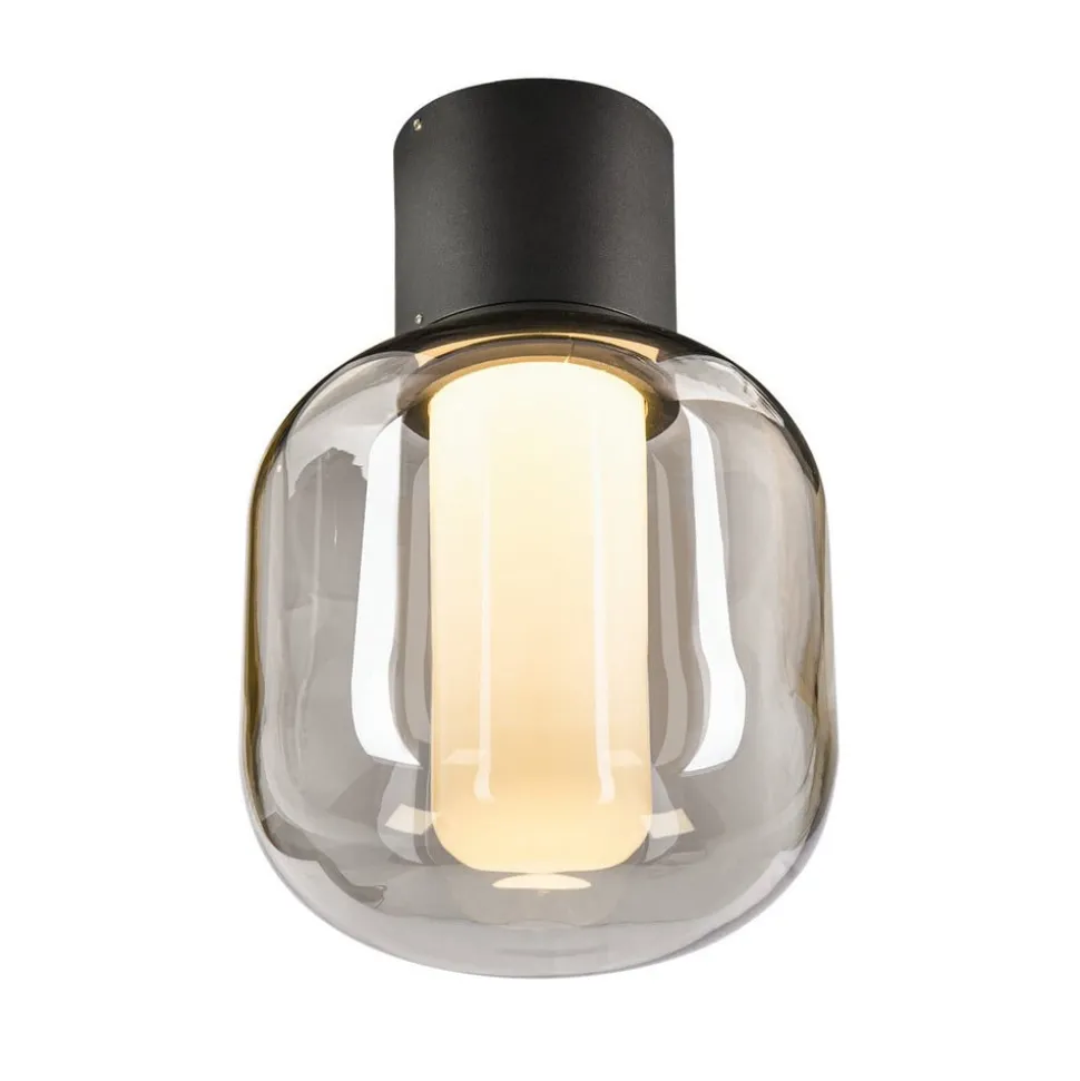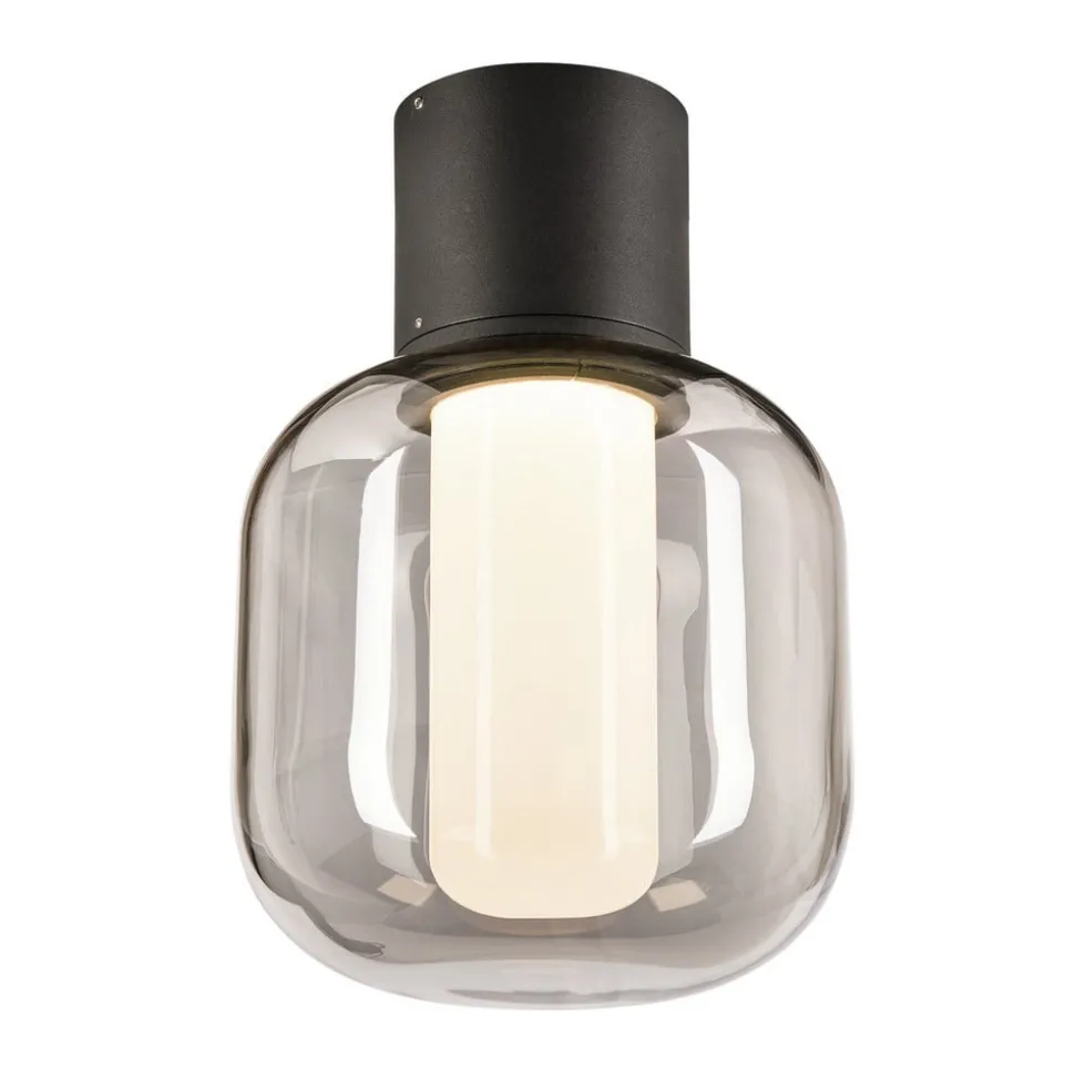 Ovalisk LED buiten plafondlamp met kap van gerookt glas en CCT-functie Deze Ovalisk serie voor buitengebruik staat voor stijlvol, modern design. De plafondlamp heeft een cilindrische basisvorm; de LED lichtbron zit in een matte diffuser die rondom gelijkmatig licht uitstraalt. Deze wordt omringd door een ovale, afgeronde kap van rookgrijs transparant glas, die gemonteerd is onder een antracietzwarte aluminium plafondbeugel. Het speciale kenmerk van de Ovalisk LED plafondlamp is de instelbare lichtkleur, die kan worden ingesteld op warmwit (3.000 K) of universeel wit (4.000 K) met behulp van een kleine schuifregelaar in de behuizing vóór installatie – Lichtopbrengst bij 4.000 K: 540 lm – Omgevingstemperatuur tijdens gebruik: – 20°C tot + 45°C