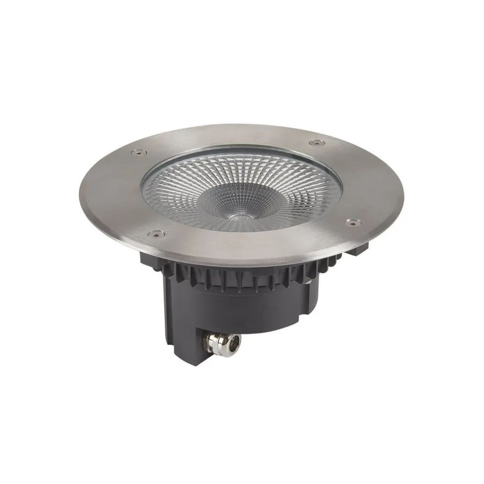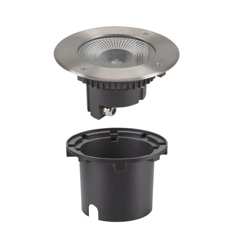 Rocci roestvrijstalen LED grondspot inbouwlamp met ronde afdekking De Rocci LED grondspot inbouwlamp is een moderne lichtbron gemaakt van roestvrij staal en glas. Het roestvrijstalen deksel is slechts 4 mm dik, waardoor het er zeer elegant uitziet, zelfs op korte gazons bijvoorbeeld. De afdekking is gemaakt van helder, gestructureerd glas, waardoor het warmwitte licht van de geïntegreerde LED’s in een brede hoek wordt uitgestraald – incl. inbouwpot – beschermingsgraad: IP67 – slagvastheid: IK08 – belastbaar tot 500 kg