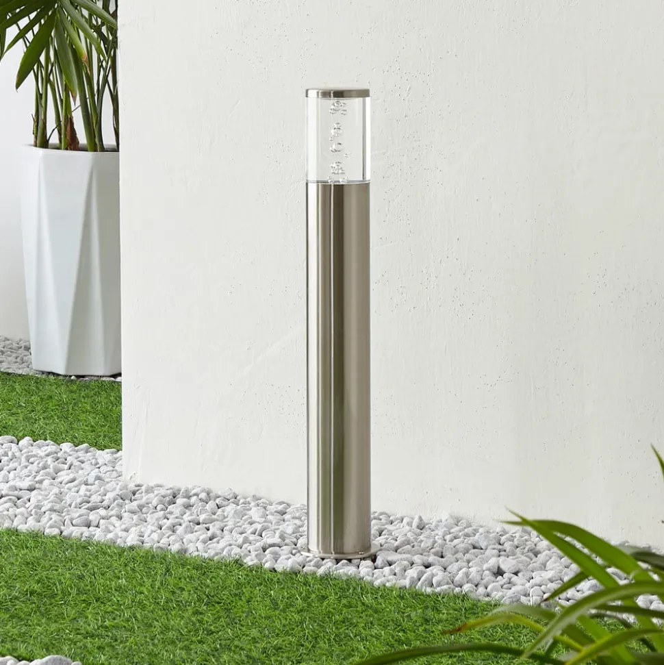 LED sokkellamp Belen uitgerust met LED’s in een aantrekkelijke cilindrische vorm Belen heeft een zeer moderne uitstraling met haar roestvrijstalen ontwerp en cilindrische vorm. Deze eigentijdse look wordt perfect benadrukt door de decoratieve luchtbellen in de acryl behuizing, die ook helpen om het lichtpatroon te definiëren. Onder deze luchtbellen bevinden zich de LED’s, die in een warmwitte lichtkleur schijnen en een naar boven gericht licht produceren dat niet veel stroom verbruikt maar toch aangenaam helder is. Hierdoor wordt de buitenruimte zelfs als het donker is mooi verlicht, zodat bewoners en bezoekers van een huis gemakkelijk hun weg kunnen vinden.