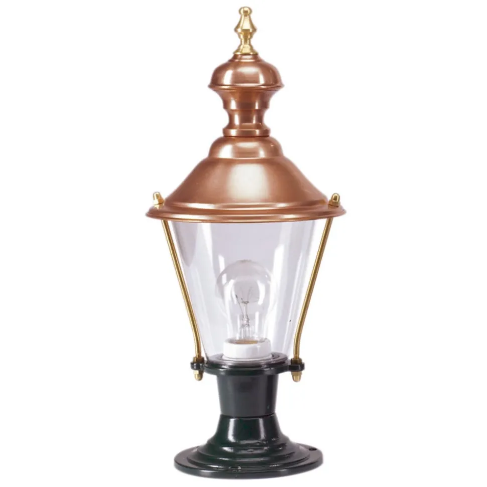 Aantrekkelijke C208 sokkellamp Deze sokkellamp maakt indruk met een smaakvol ontworpen koperen afdekking die perfect harmonieert met het glanzende metaal en de lamp een stijlvolle algemene uitstraling geeft. De lamp zorgt niet alleen voor meer veiligheid buitenshuis, maar heeft ook een zeer decoratief effect. Installatievoorschrift: De lamp wordt rechtstreeks op de fitting aangesloten. We raden aan om de installatie te laten uitvoeren door een gekwalificeerde elektricien, aangezien de fabrikant aanbeveelt om hiervoor rubberen kabels te gebruiken