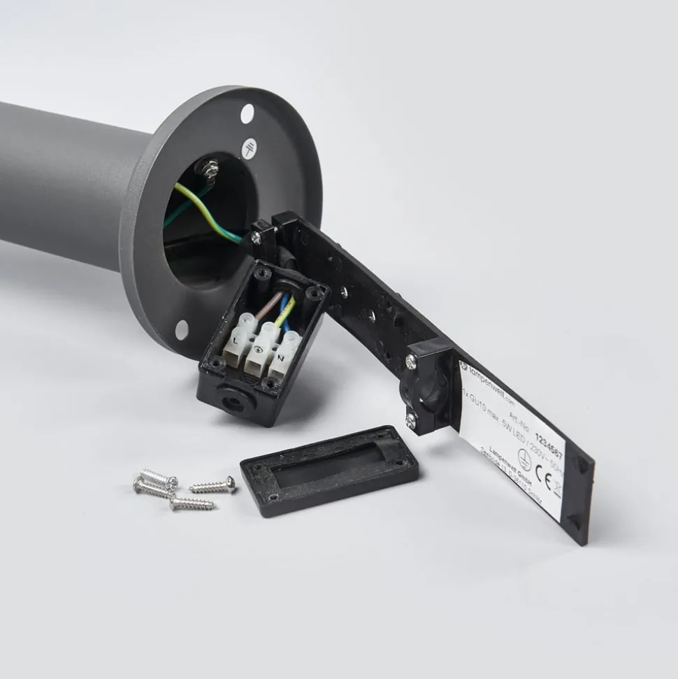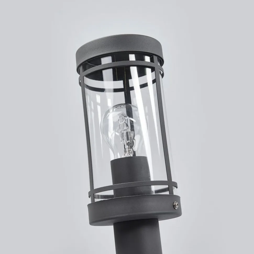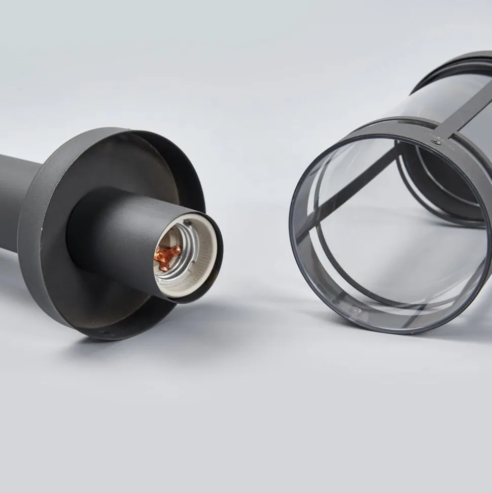 Slanke sokkellamp Djori met donkergrijs frame Deze sokkellamp is ideaal voor montage op kleinere verhogingen in buitenruimtes, zoals een muur. Djori komt dan goed tot zijn recht en wordt verwelkomd als een nuttige lichtbron. Het onderste gedeelte bestaat uit een smalle metalen buis, terwijl de cilindrische kap met een helder polycarbonaat inzetstuk bovenaan zit. Het heldere oppervlak zorgt ervoor dat het volledige licht wordt uitgestraald en dat niets van de helderheid van de gebruikte lamp verloren gaat. De look, inclusief de donkergrijze afwerking, past heel goed bij moderne tuinen en opritten.