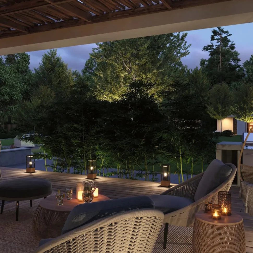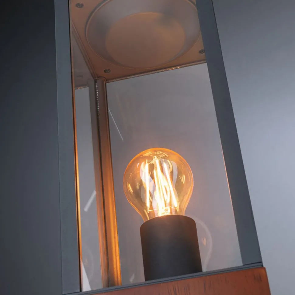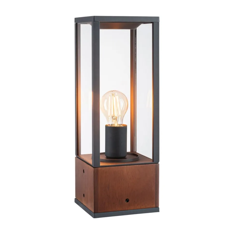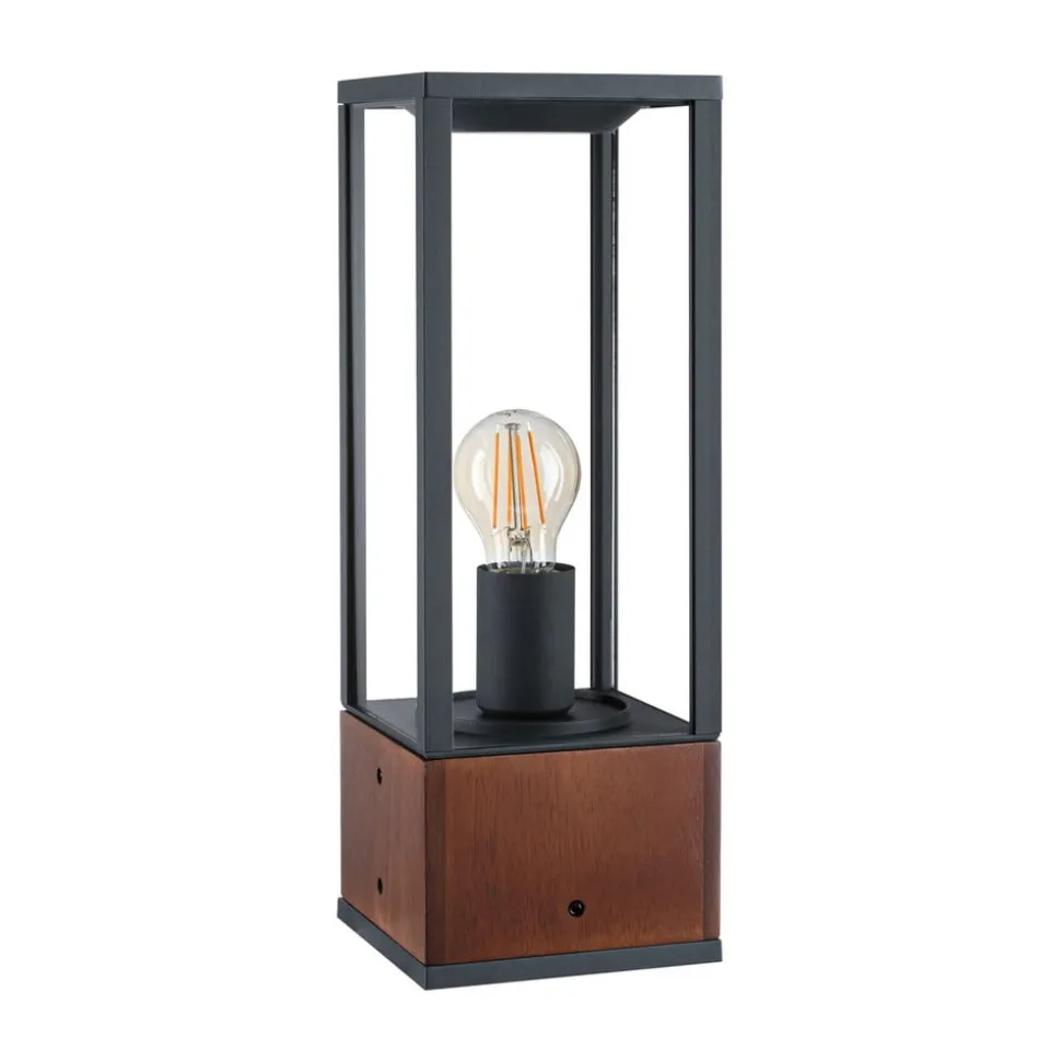 De lampvoet Timba presenteert zich in de vorm van een rechtlijnige, moderne lantaarn. Het dankt zijn bijzondere charme aan de combinatie van hout en zwart metaal, die een hoekige lantaarn vormt als een open kubus van stijlen. De lantaarn heeft een E27 fitting die kan worden voorzien van een lamp naar keuze. Het licht wordt naar alle kanten uitgestraald, zodat de basisarmatuur veilig terrassen of paden verlicht. Tegelijkertijd is hij door zijn stijlvolle vormgeving een mooie decoratie, ook als hij is uitgeschakeld