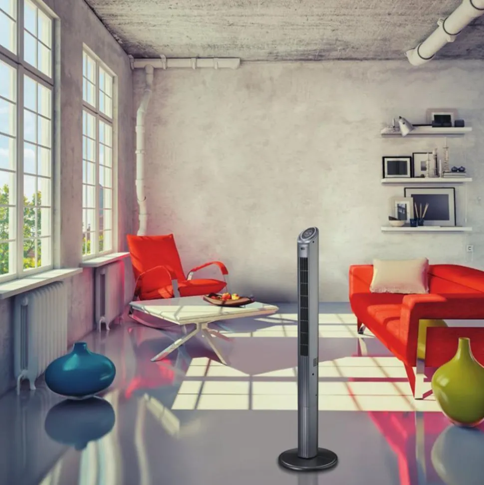 De Highland I is een standventilator in elegant antraciet ontwerp van kunststof, die niet alleen visueel indrukwekkend is, maar ook zeer functioneel.