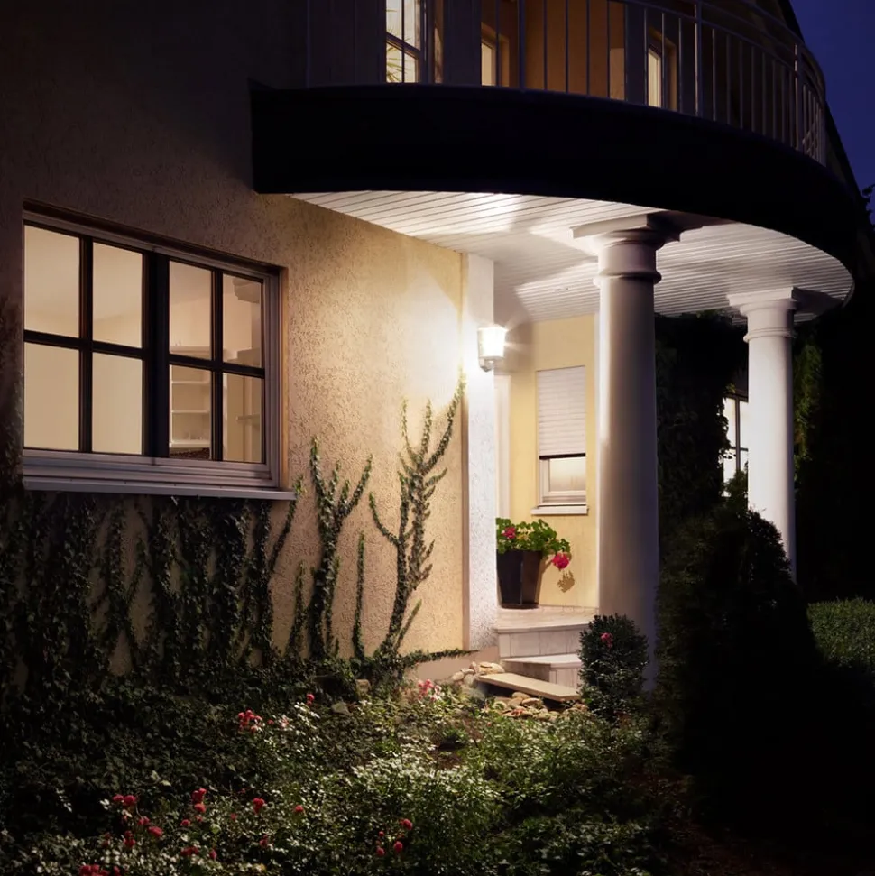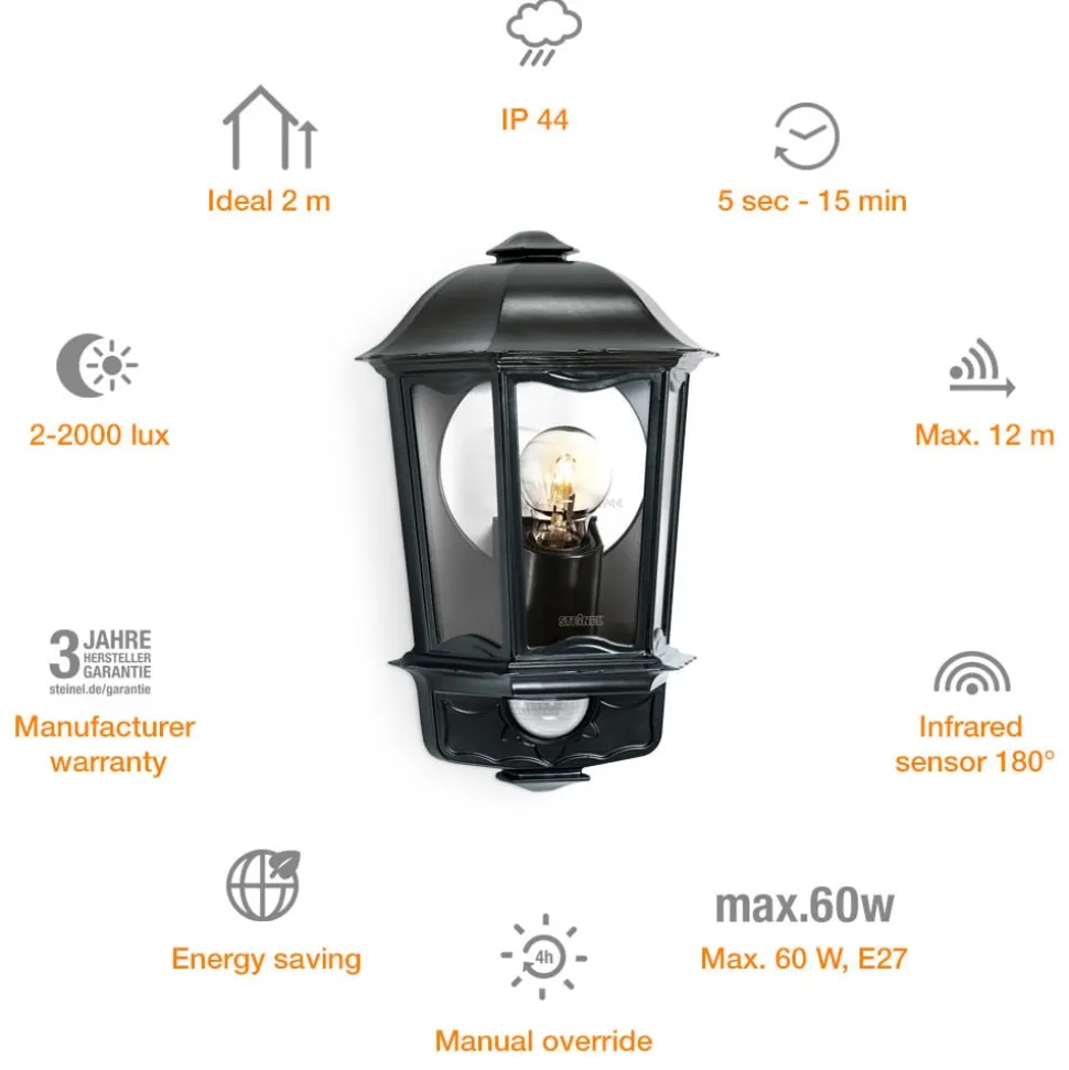 Buitenwandlamp L 190 S in klassieke lantaarnvorm – uitgerust met bewegingsmelderDe buitenwandlamp L 190 S is gemaakt van hoogwaardig roestvrij staal en uitgerust met STEINEL multisensortechnologie. Een zachte lichtstart is geïntegreerd. De basislichtsterkte wordt aangepast via Watt-o-matic (0-50 %). Als er beweging plaatsvindt, schijnt het licht op volle sterkte gedurende de vooraf ingestelde tijd. De continue verlichting (4 uur) wordt ingesteld via de hoofdschakelaar. Het detectiebereik kan worden beperkt door middel van afdekplaten (meegeleverd). Tijden van 5 seconden tot 15 minuten kunnen worden ingesteld. De detectiehoek is 180°, de openingshoek 90°. Er kunnen geen spaarlampen worden gebruikt in de L 190 S.- Instelling van het bereik door de multilens te draaien tot max. 5 m tot max. 12 m- Lichtduur en schemeringsdrempel en helderheidsregeling kunnen worden ingesteld via handige functietoetsen- Schemerinstelling 2 – 2.000 lux- Kan niet worden gebruikt met spaarlamp- Montagehoogte max. 4 m- Beschermingsklasse IP44