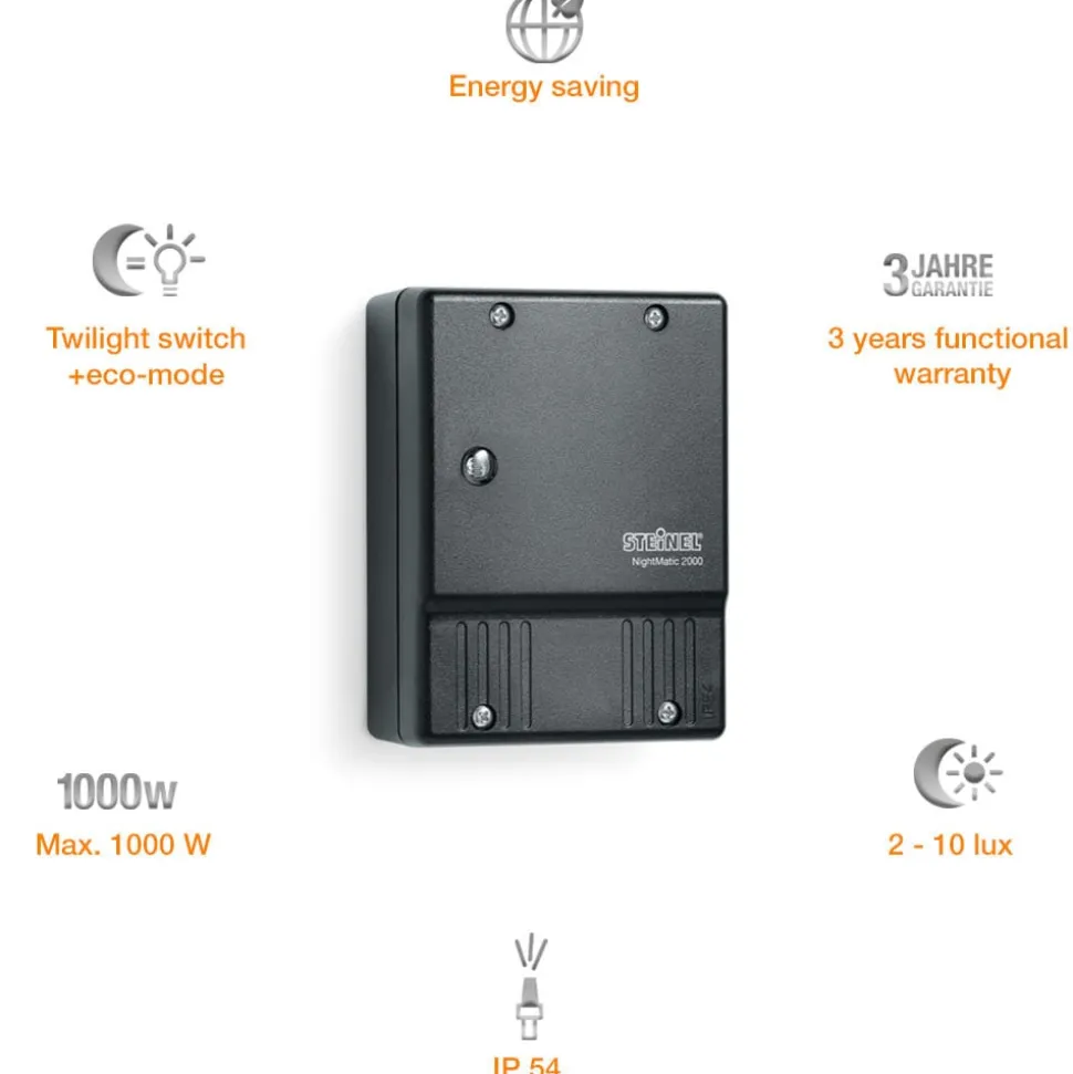 De NightMatic 2000 registreert de omgevingshelderheid en schakelt aangesloten armaturen ’s avonds bij het bereiken van de schemeringsdrempel automatisch in en bij zonsopgang weer uit.