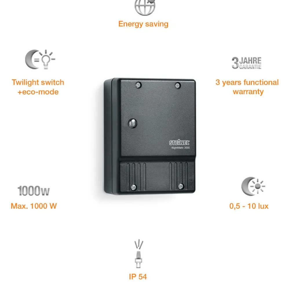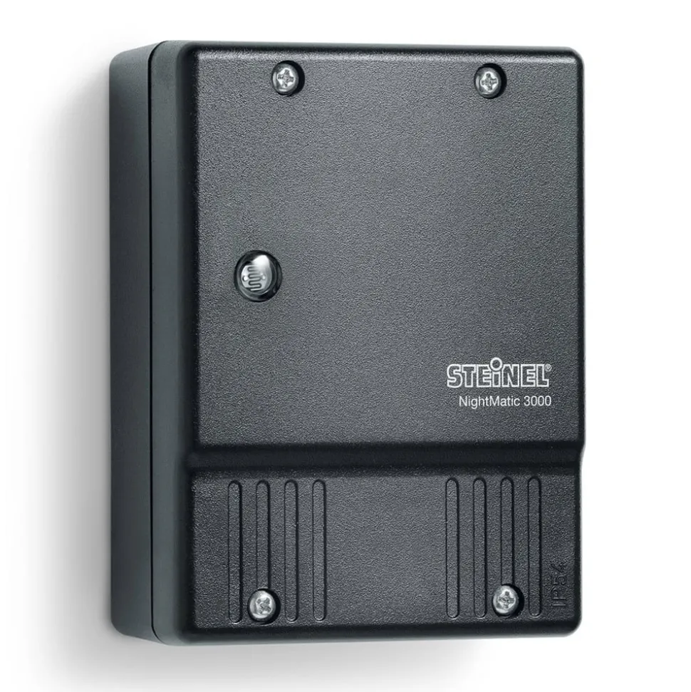 De NightMatic 3000 registreert de omgevingshelderheid en schakelt aangesloten armaturen ’s avonds bij het bereiken van de schemeringsdrempel automatisch in en bij zonsopgang weer uit. Met zijn Vario nachtspaarstand helpt hij ook elektriciteit te besparen. Indien gewenst, schakelt het licht ’s nachts na een programmeerbare tijd automatisch uit en ’s morgens rond 5 uur weer aan – als het dan nog donker is. Hij is uitgerust met zelflichtcompensatie, d.w.z. dat een externe armatuur in de nabijheid de werking ervan niet verstoort.