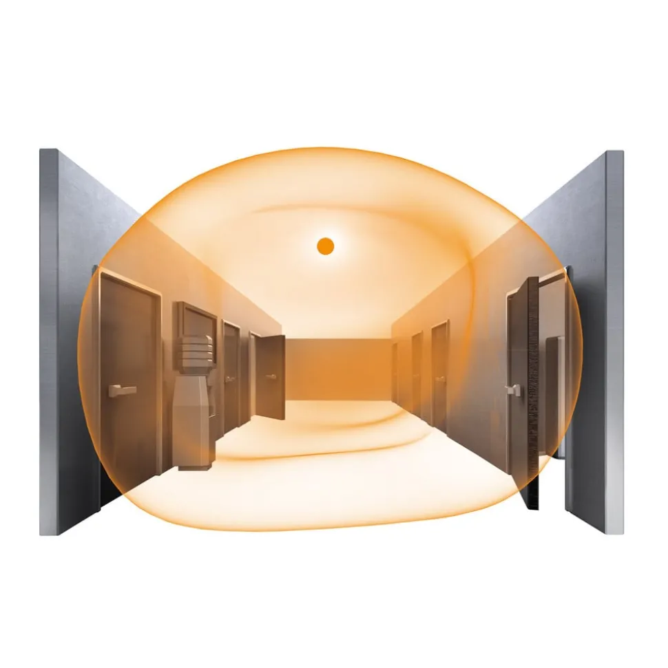 Dankzij de HF-bewegingssensor met een detectiehoek van 360° kunt u deze lamp van alle kanten benaderen om haar te activeren. Dit maakt het bijzonder interessant voor ruimten die vanuit verschillende richtingen kunnen worden betreden, zoals een gang, een trappenhuis of de garage. De hoge luchtvochtigheid die meestal in deze ruimtes en vooral in badkamers heerst, hindert de RS Pro LED P2 Flat S niet vanwege zijn hoge beschermingsklasse en zelfs grotere ruimtes zijn geen probleem voor deze plafondlamp omdat het bereik van de sensor 8 meter is.