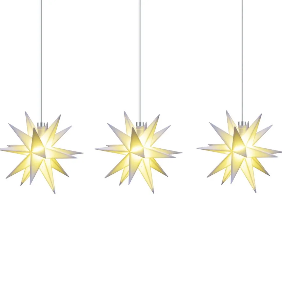 De LED-lichtketting ster is versierd met drie kleine, 18-puntige sterren van kunststof, die door hun mooie vorm een echte blikvanger zijn. Met de batterijgevoede lichtketting creëert u in een handomdraai een kerstsfeer in elke ruimte, zonder dat er een stroomaansluiting in de buurt hoeft te zijn.
