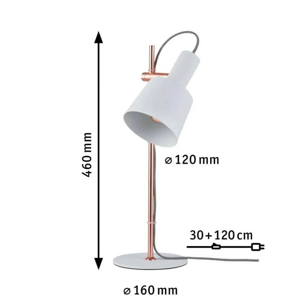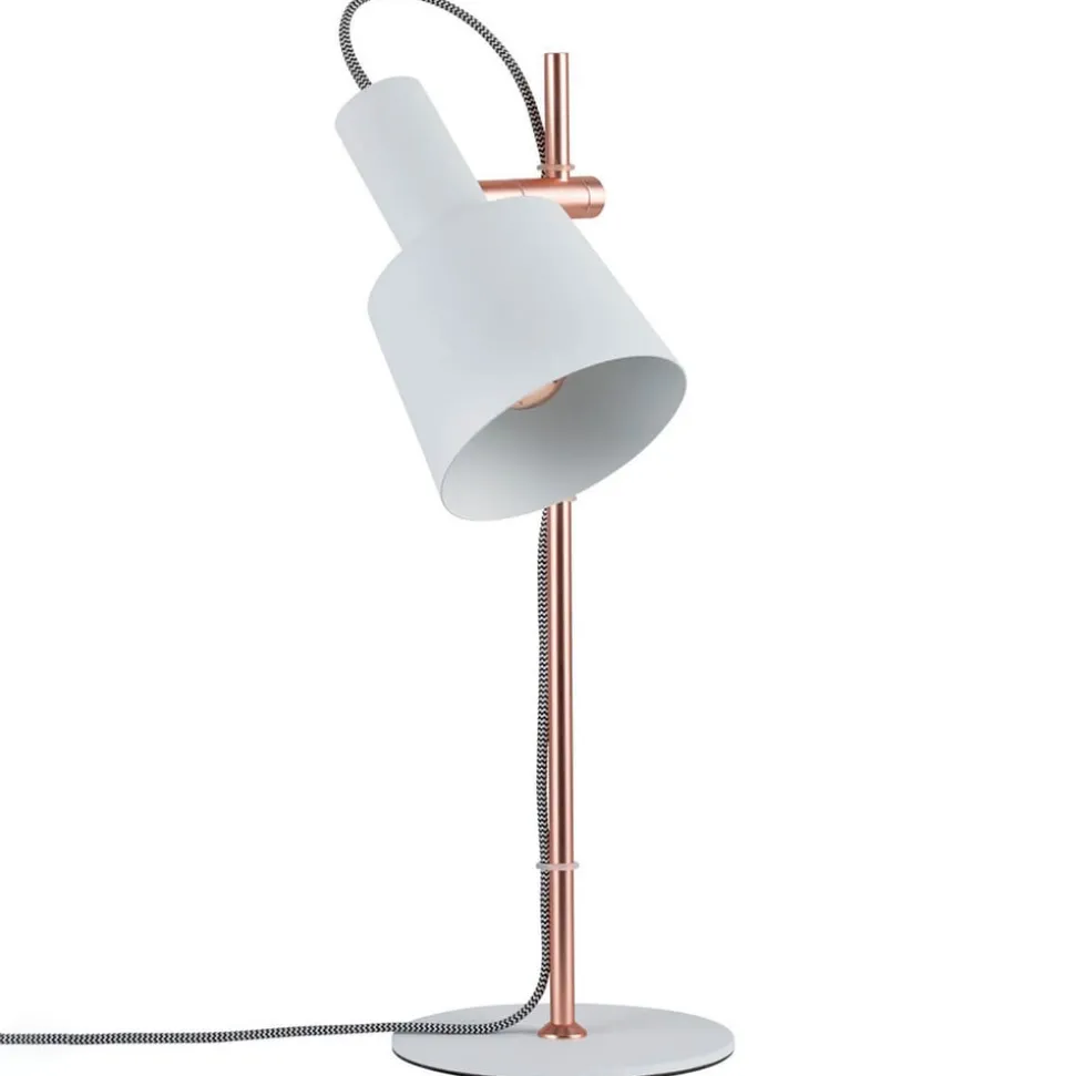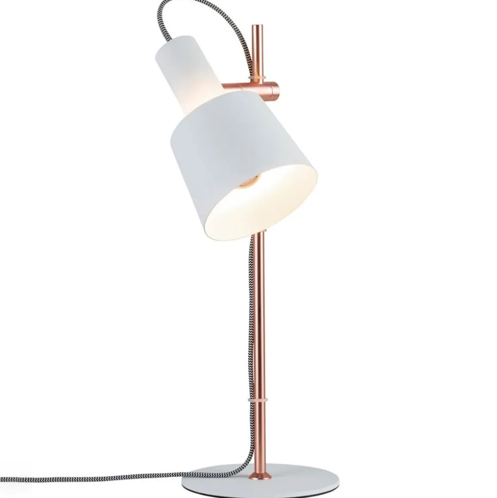 De van metaal gemaakte tafellamp Haldar heeft een draaibare kap, waardoor de lichtrichting naar elke situatie kan worden aangepast. De lamp is heel indrukwekkend door de koperkleurige lak van het sierlijke armatuur dat aan de ronde voet is bevestigd, en waaraan de bovenkant zich de kap bevindt.