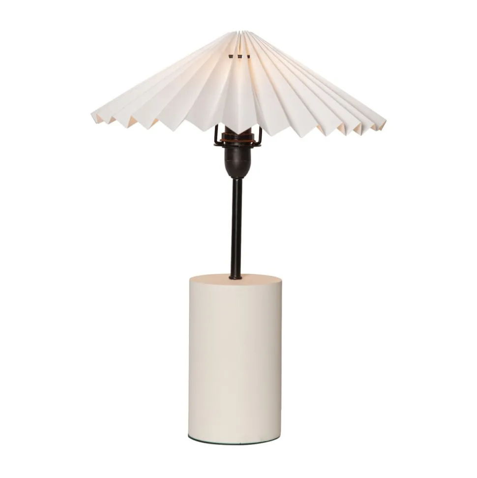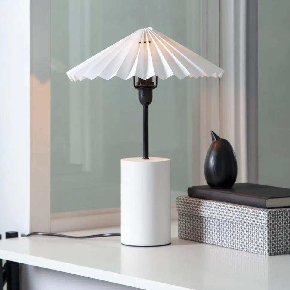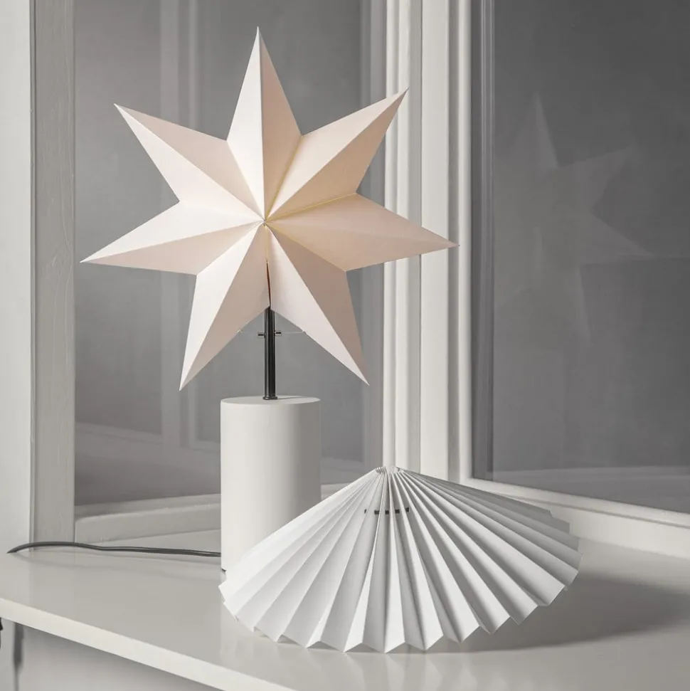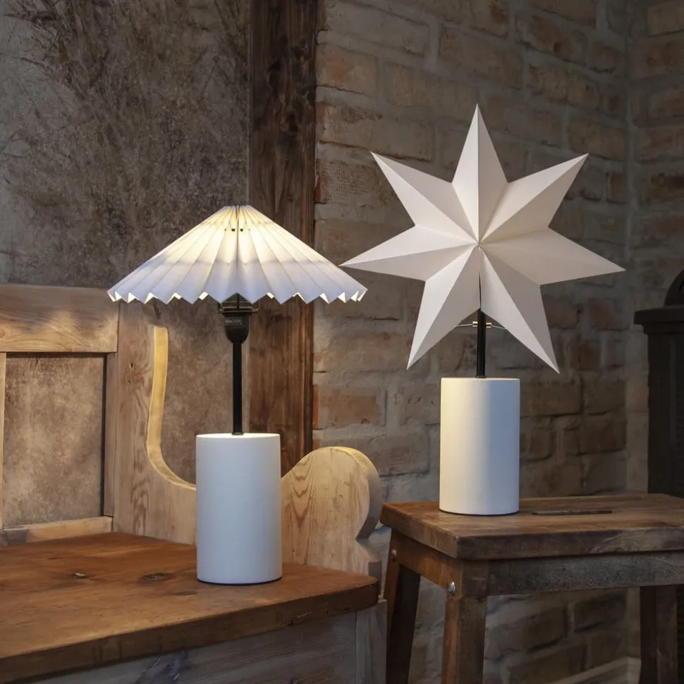 Witte Stila tafellamp met verwisselbare kappen De Stila tafellamp kan in een handomdraai worden omgetoverd van een eenvoudige extra lichtbron tot een stralende kerstdecoratie. Er worden twee witte papieren kappen meegeleverd – een platte, geplooide kap voor verlichting het hele jaar door en een ster voor kerstverlichting. De cilindervormige, witte voet is ook van hout.
