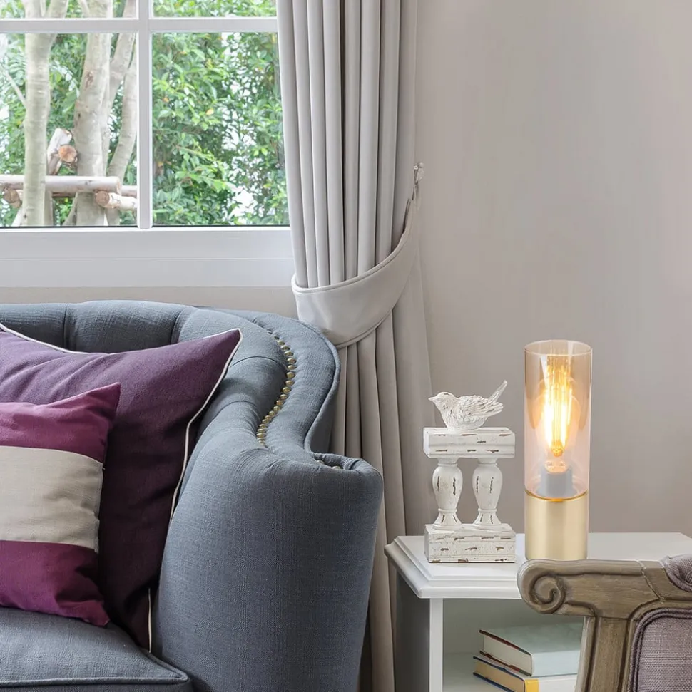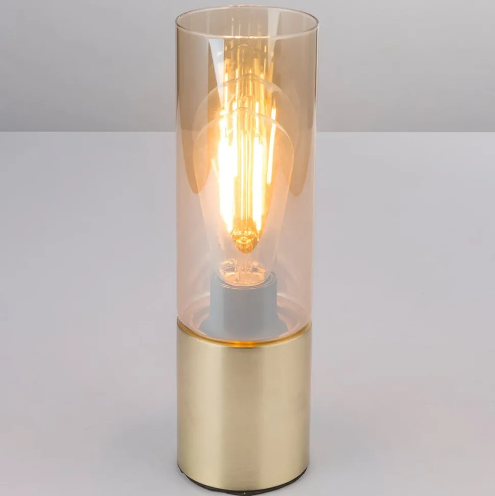 De lampenkap in cilindrische vorm bekoort door het amberkleurige glas, dat een zicht op de geïntegreerde lichtbron mogelijk maakt. Met de handige aanraakschakelaar kan de lamp snel worden in- of uitgeschakeld. De tafellamp verrast vooral door zijn matte messing toon, die zorgt voor een eenvoudig en toch elegant design dat overal tot zijn recht komt.