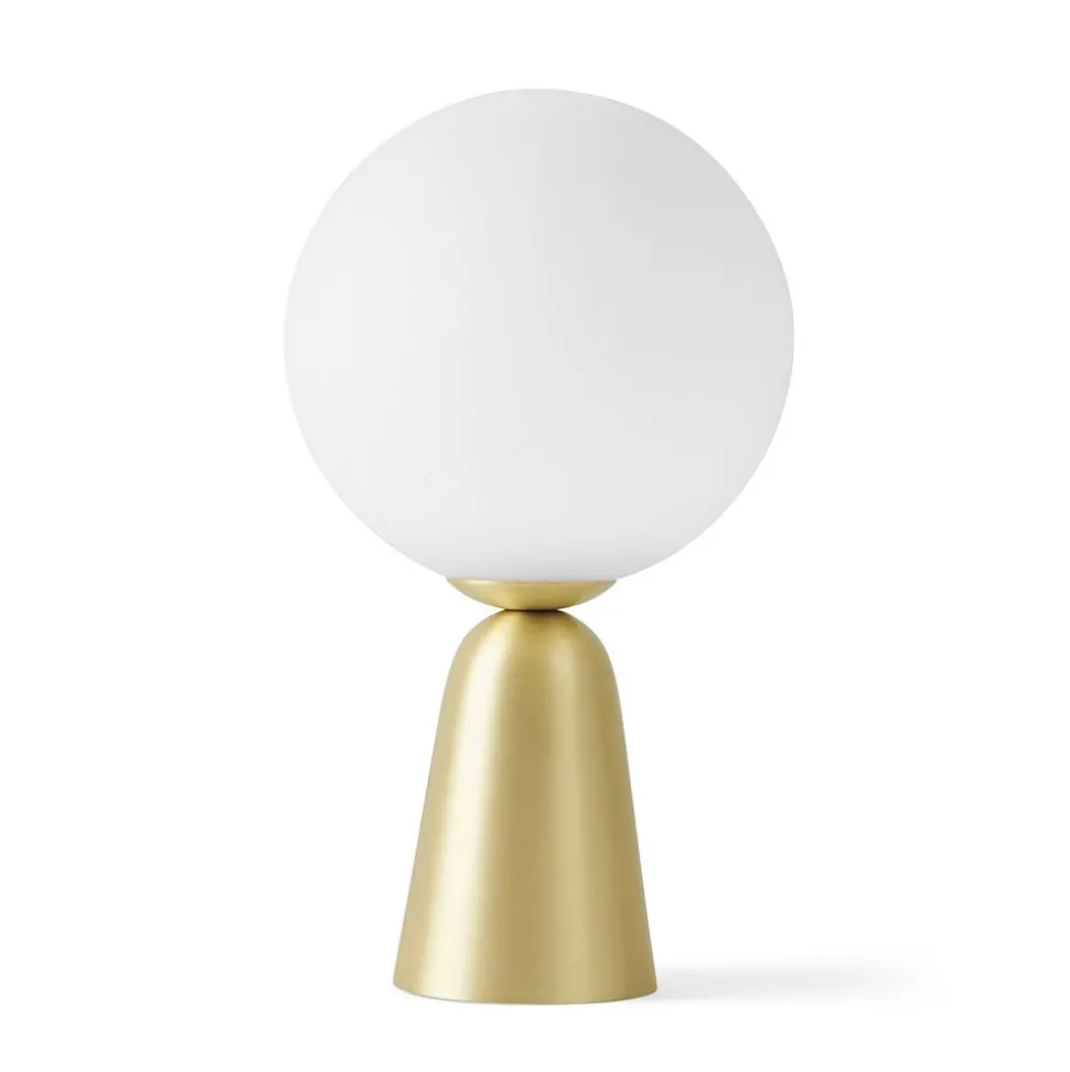 Op de vensterbank, het nachtkastje, het dressoir of de restauranttafel verschijnt de tafellamp als een harmonieus en elegant accessoire in een modern design. De bolvormige kap van geblazen matglas verlicht de ruimte rondom in een zacht licht, waarvan de helderheid kan worden geregeld met de dimschakelaar op de kabel. De conische metalen voet in mat messing afwerking rondt de tafellamp af als een nobel detail.
