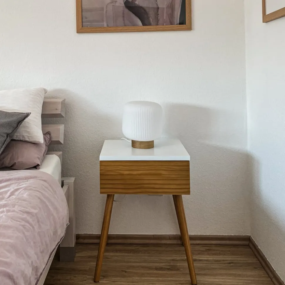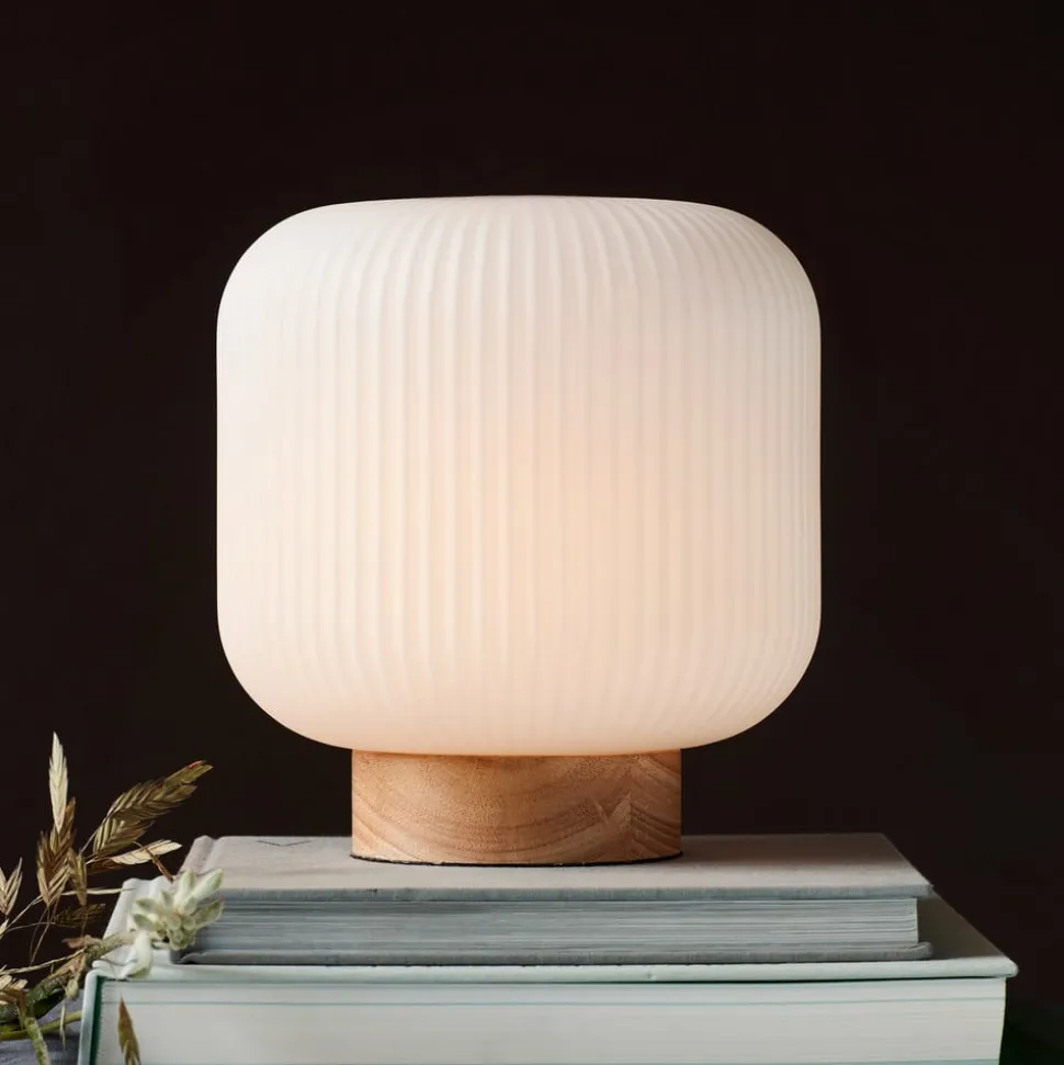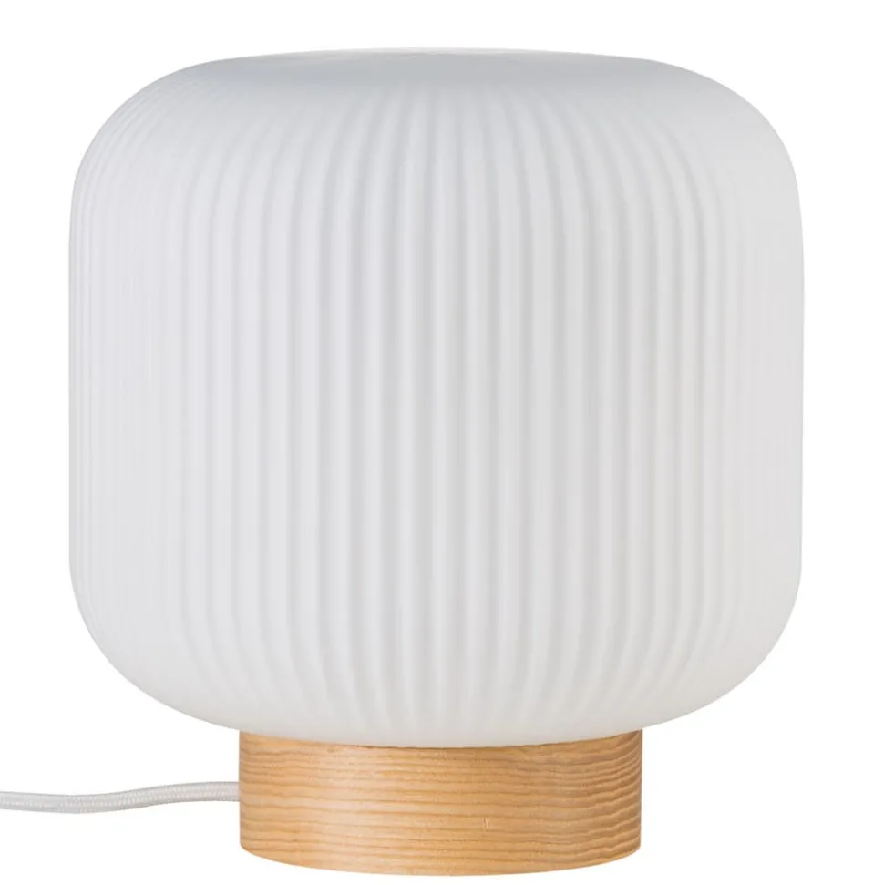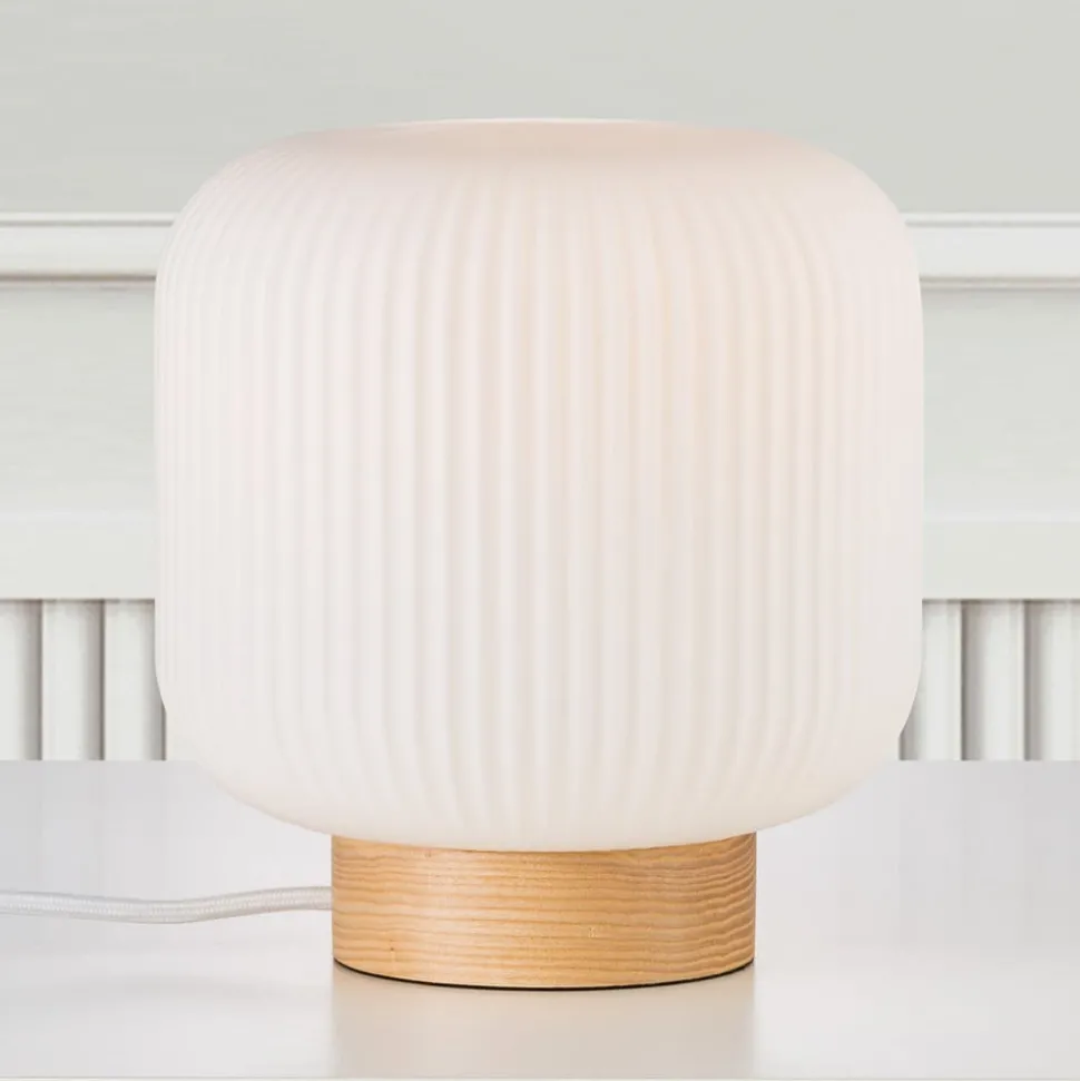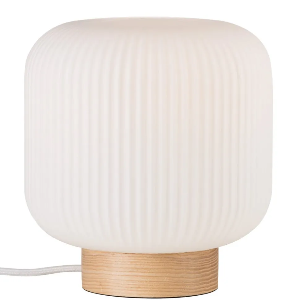 De tafellamp Milford straalt in elke ruimte de flair van Scandinavië uit. De ronde, vlakke voet van de armatuur van licht hout in combinatie met de witte glazen kap, die rondom is bewerkt met een fijne gegroefde structuur, maakt de armatuur tot een lichtbron met een heel bijzondere charme en met een heel mooi lichteffect. Het licht schijnt verblindingsvrij en zeer gelijkmatig door de gegroefde kap en zet het groevenpatroon decoratief in scène. Milford is perfect voor het nachtkastje of voor de vensterbank.