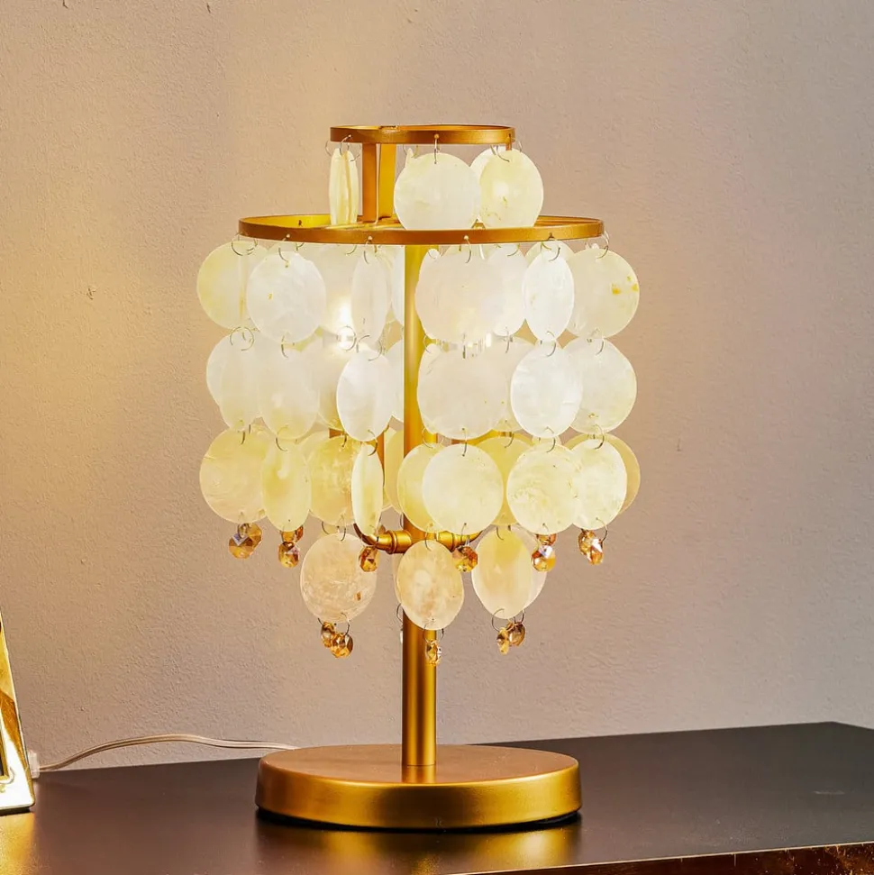 De tafellamp Ruben combineert een elegant design met functionele veelzijdigheid. De lamp is gemaakt van hoogwaardig metaal en versierd met glanzende parelmoeren schijven en vormt een stijlvol accent in elke ruimte. De harmonieuze kleurencombinatie van goud en parelmoer geeft de lamp een luxe uitstraling en creëert een warme en uitnodigende sfeer in zowel de woonkamer als de slaapkamer of eetkamer.