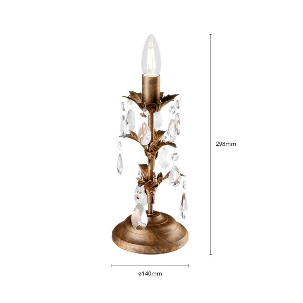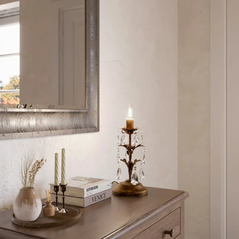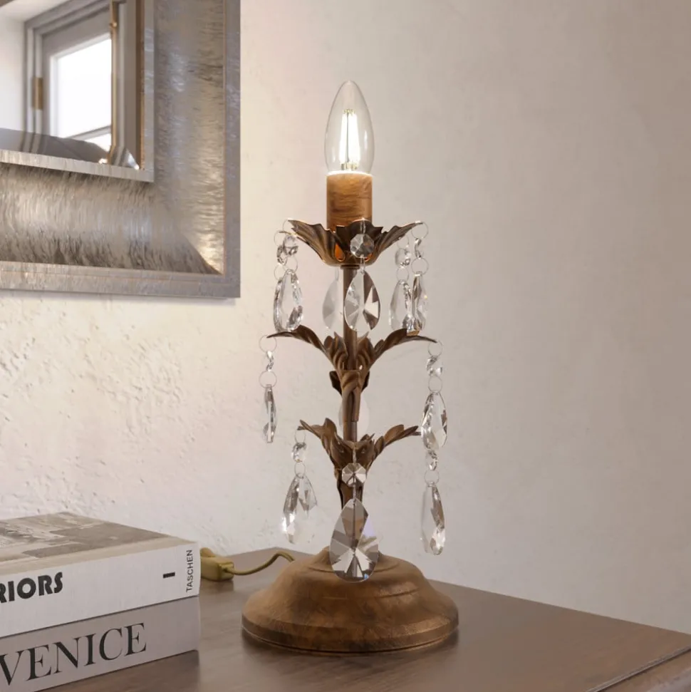 De tafellamp Teresa combineert kunstig gesmeed ijzer met sprankelend K9-kristalglas en brengt zo een vleugje antieke elegantie in elke ruimte. De combinatie van bronskleur en heldere kristallen zorgt voor een fascinerend spel van licht en schaduw, dat zowel in de woonkamer als in de eetkamer een bijzondere sfeer creëert.