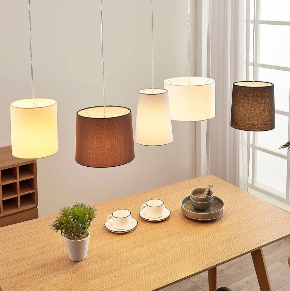 Hermina heeft een aantrekkelijke uitstraling en past perfect bij de meeste stijlen die als “Young Living” kunnen worden omschreven. Er zijn vijf stoffen kappen die via kabelophangingen vanuit het plafond hangen. Elke kap is individueel qua vorm en kleur en creëert een onderscheidende look. Daarnaast zorgt de vorm van stoffen kappen voor warme en comfortabel verlichting, wat ook textiel-hanglamp Hermina een eersteklas succes maakt. Wanneer het boven een eettafel of een salontafel wordt geplaatst, straalt het pure gezelligheid uit en heeft hij een stijlvol en huiselijk effect op de sfeer.