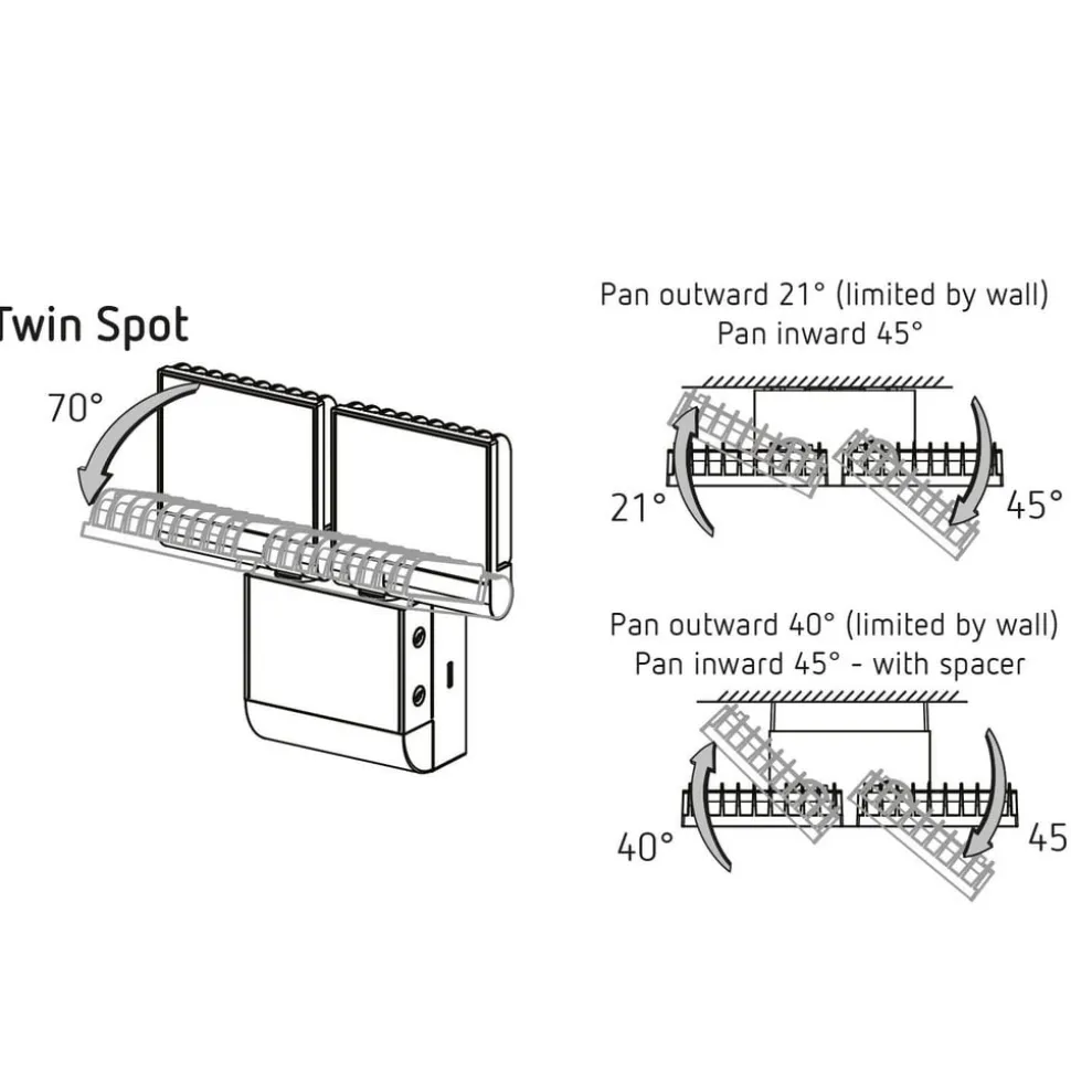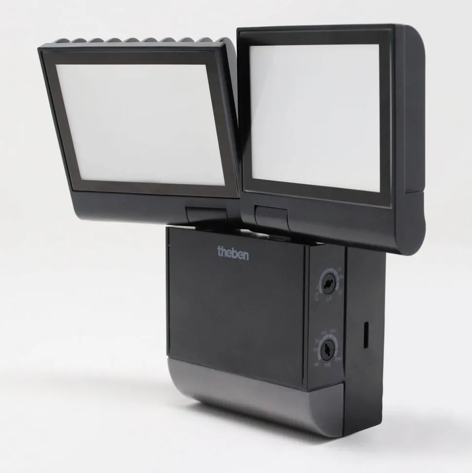 LED buiten wandlamp 2-lamps met bewegingsmelder De Theben theLeda S17-100 is een aantrekkelijke, draadgebonden LED spot voor buiten met een geïntegreerde bewegingsmelder en twee LED panelen die draaibaar en zwenkbaar zijn (horizontaal ± 20/45° en naar beneden 70°). De krachtige spot is perfect voor gebruik in particuliere woningen, bijvoorbeeld voor het verlichten van de keldertrap, de entree of het gebied in en rond de carport. Bij een montagehoogte van 2,5 m is de detectiehoek 180° met een bereik van 10 m. Gemonteerd op de muur zorgt hij voor een betrouwbare automatische verlichtingsregeling afhankelijk van aanwezigheid en lichtsterkte en heeft hij een extra uitgang voor het schakelen van andere lampen/verbruikers. Het detectiebereik met kruipbeveiliging detecteert betrouwbaar alle bewegingen en de nalooptijd en luxwaarden kunnen eenvoudig op het apparaat worden ingesteld. Dankzij de hoge beschermingsgraad IP 55 is vocht geen probleem. Handmatige override is mogelijk met een drukknop.
