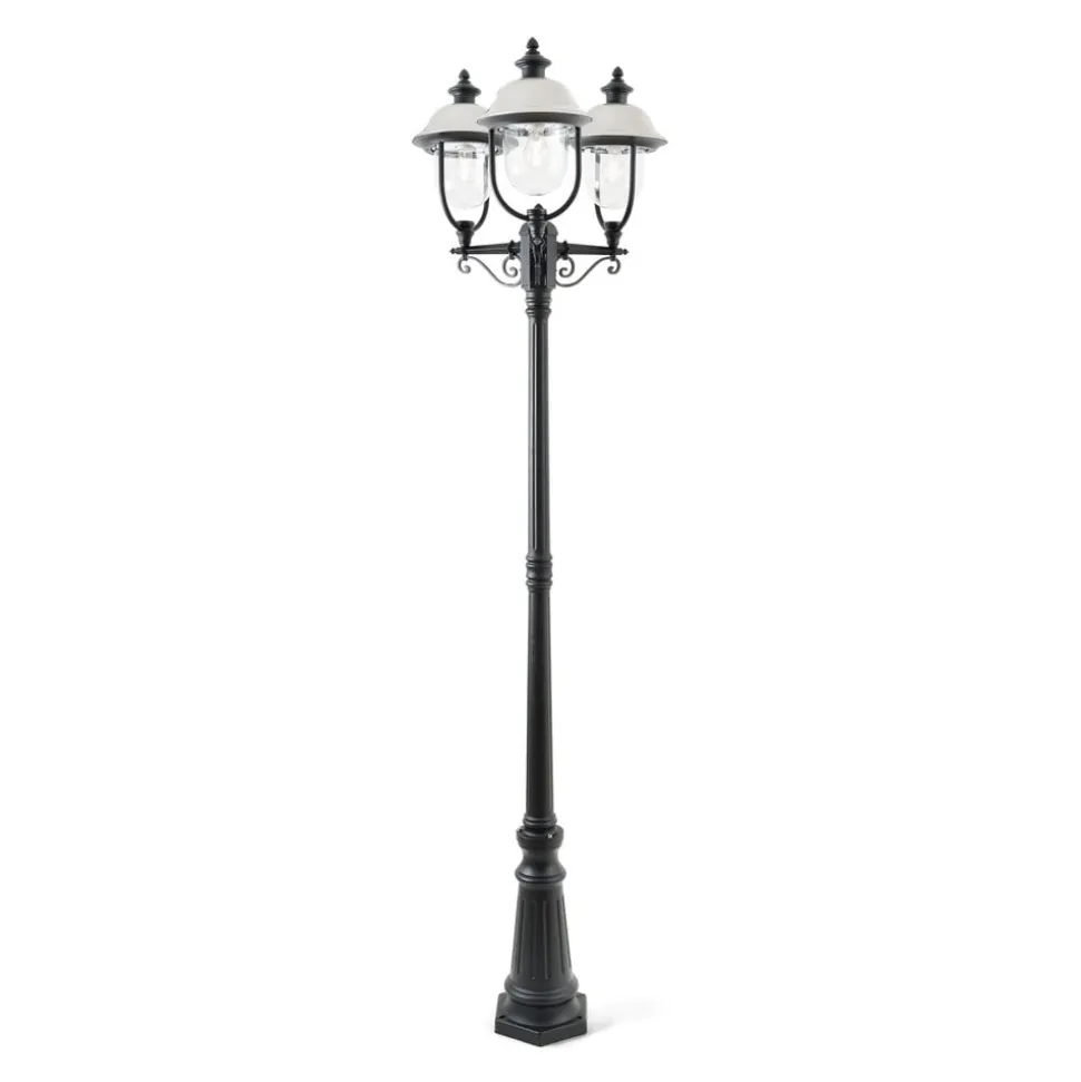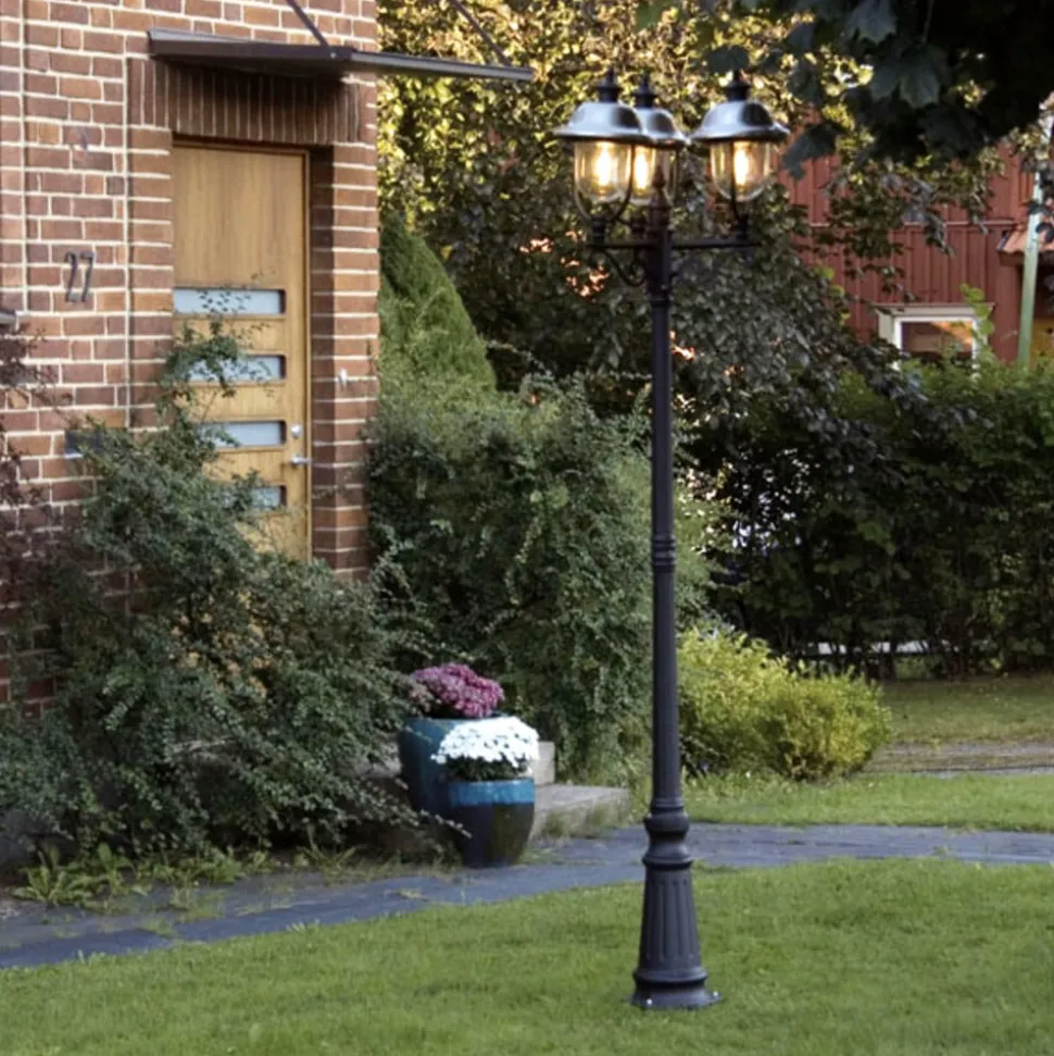 Het heldere lampenglas garandeert bij deze lamp een optimale verlichting. Het klassieke design in zwart ziet er ronduit tijdloos uit en is thuis op elke plek. De 3 lantaarns zijn in een driehoek op de paal aangebracht.