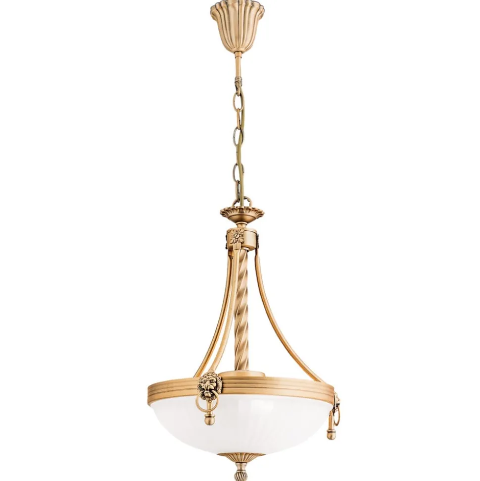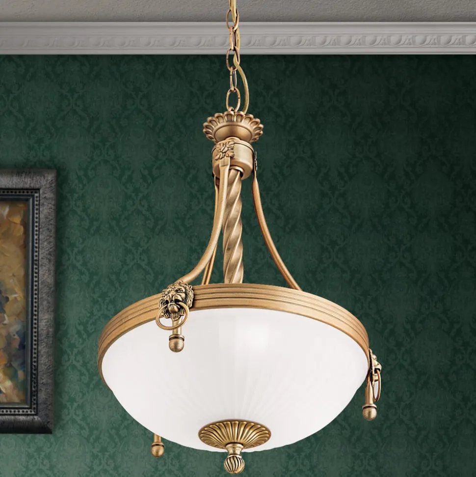 Edele hanglamp Rocca met bronskleurige decoratieve delenDe kap van hanglamp Rocca is niet alleen vormelijk, maar ook een lust voor het oog. Het glas in witte albastlook is vormgegeven als een gebogen halve bol, die aan de bovenranden en de centrale punt bronskleurige applicaties heeft. Een hoogtepunt van deze applicaties zijn de bronskleurige leeuwenkoppen. De kap bestaat uit een stabiel gegoten deel. De kettinglengte kan bij de montage individueel worden ingekort. Verblindingsvrij en altijd zacht, warm licht is gegarandeerd met de hanglamp Rocca.