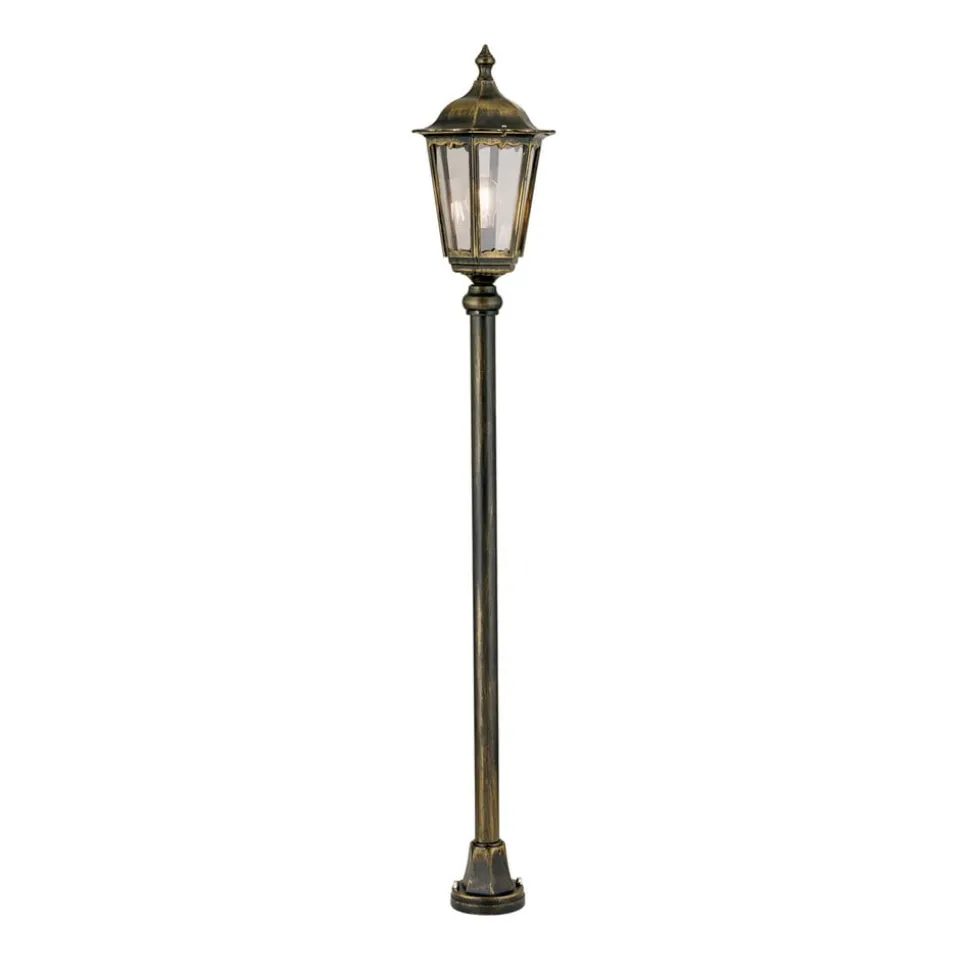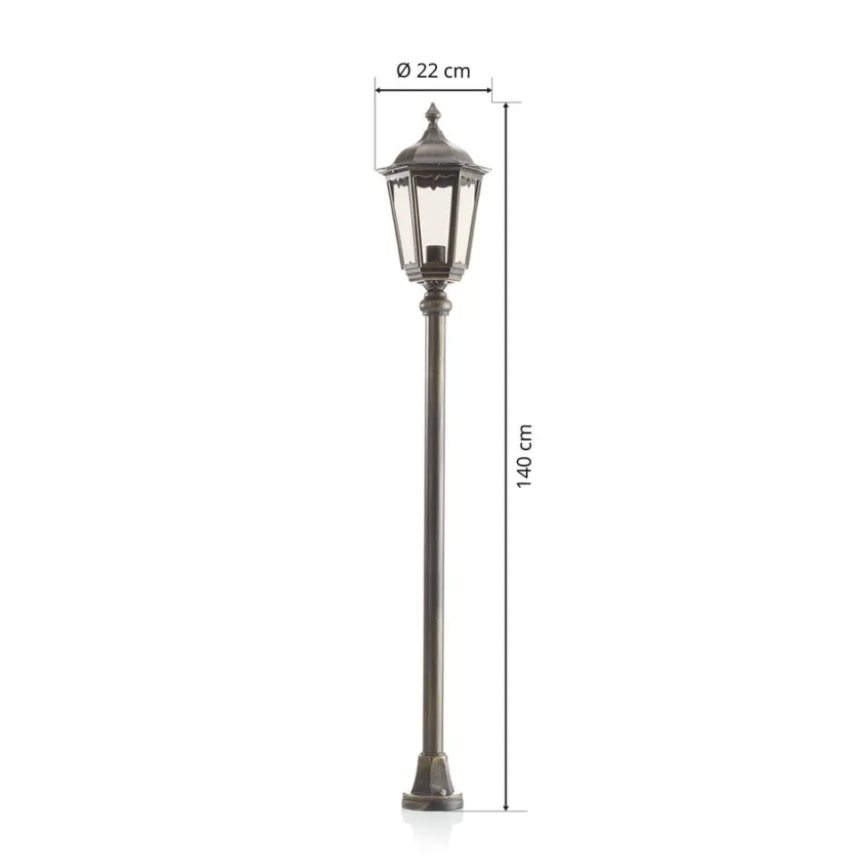 De verlichting uit de Puchberg-serie zorgt voor een veilige nachtverlichting en biedt overdag een aantrekkelijk uiterlijk: de armatuur glanst in zwart-goud terwijl de vensterglazen in de lampkop in zacht rookgrijs zijn uitgevoerd.
