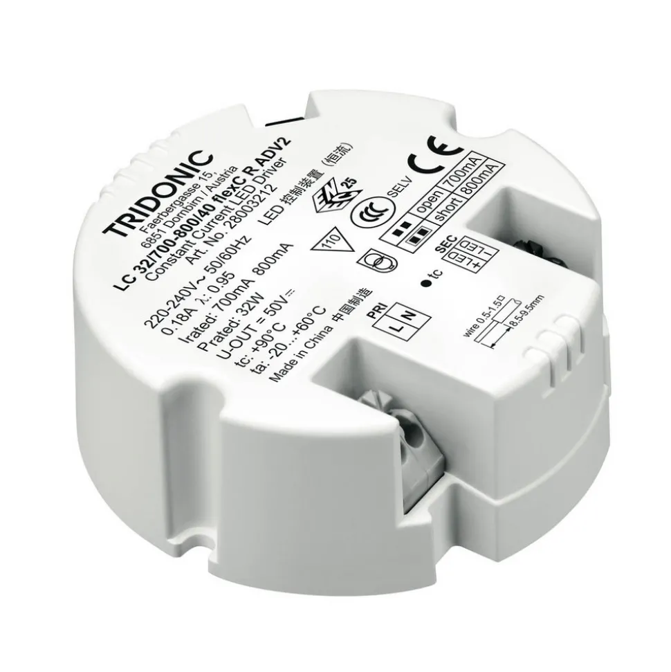 Ronde constante stroom LED-driver LC flexC R ADV2 IP20 van TRIDONIC voor de installatie van armaturen, uitgangsstroom instelbaar in twee stappen