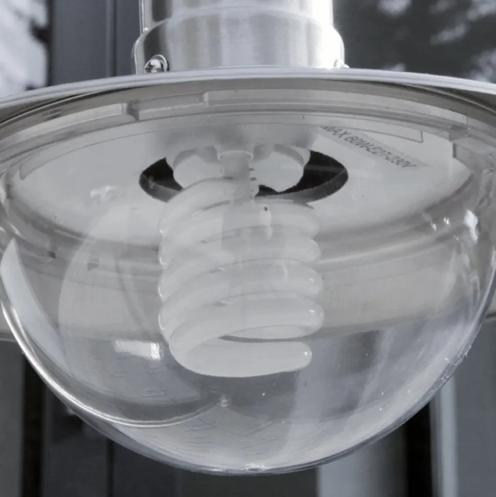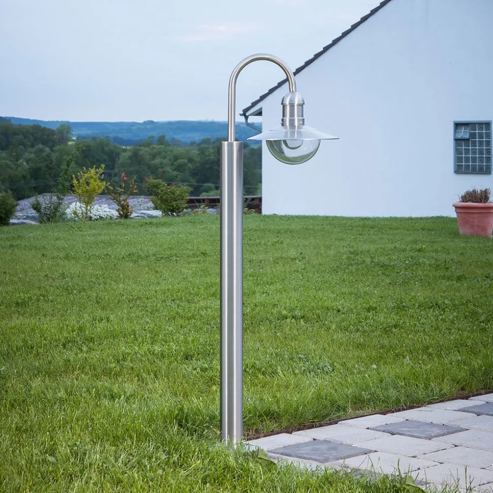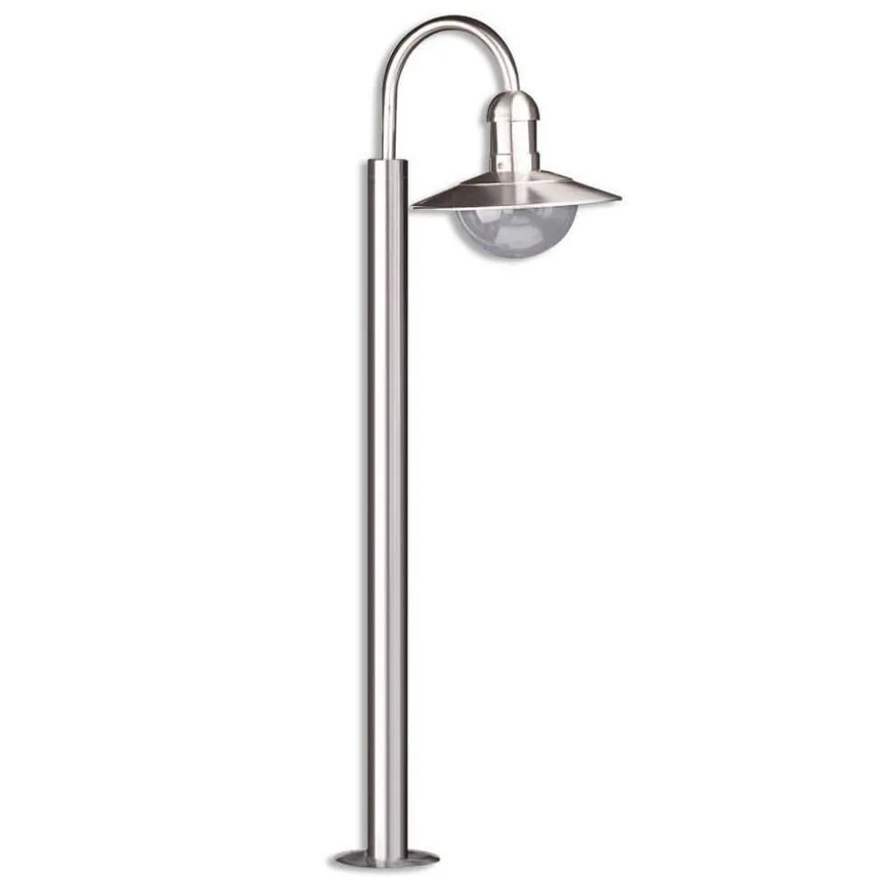 Damion roestvrijstalen tuinpadverlichting met heldere kap De Damion tuinpadverlichting heeft een ietwat speelse uitstraling dankzij het gebogen frame en de halfronde, naar beneden gerichte kap van polycarbonaat, die de lamp onthult. Het roestvrijstalen armatuur kan opritten en entrees net zo stijlvol verlichten als paden en trappen in openbare parken of in de tuin thuis.