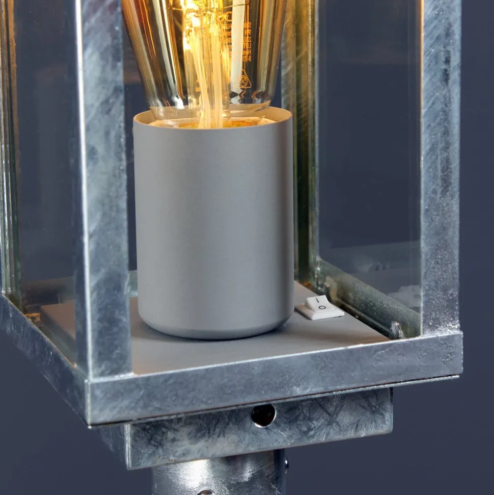 Met of zonder schemersensor te gebruiken: Karo padlamp van aluminium en glas, IP44De Karo padlamp van verzinkt aluminium heeft een schemersensor. Deze kan optioneel via een schakelaar in de kap worden uitgeschakeld. Als de sensor niet actief is, kan deze padlamp via de conventionele wandschakelaar worden in- en uitgeschakeld. Karo is beschermd tegen spatwater en biedt plaats aan een E27 lamp. Omdat deze zichtbaar is door het heldere glas van de kap, wordt een lamp met zichtbare gloeidraden aanbevolen (zie accessoires).