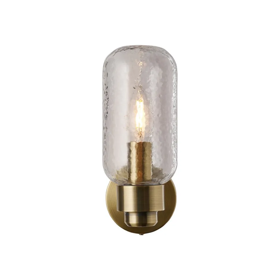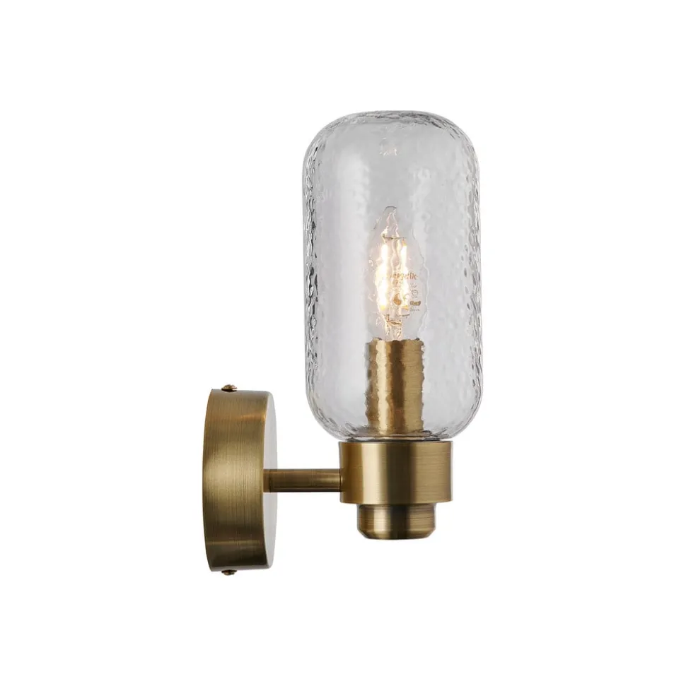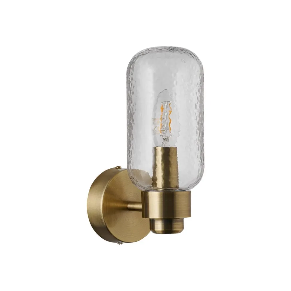 Wandlamp Tutan met glazen fitting en beschermingsgraad IP44 Tutan is een wandlamp met een elegant ontwerp met Art Deco referenties. Het heeft een messingkleurig frame met een naar boven gerichte E14 fitting en een gesloten kap van transparant, licht getextureerd glas. Met een beschermingsgraad van IP44 is het perfect voor de badkamer en kan het individueel of als paar naast de badkamerspiegel worden geplaatst. De wandlamp ziet er bijzonder aantrekkelijk uit met een LED wandlamp met gloeidraadtechnologie. Er wordt geen lamp meegeleverd.