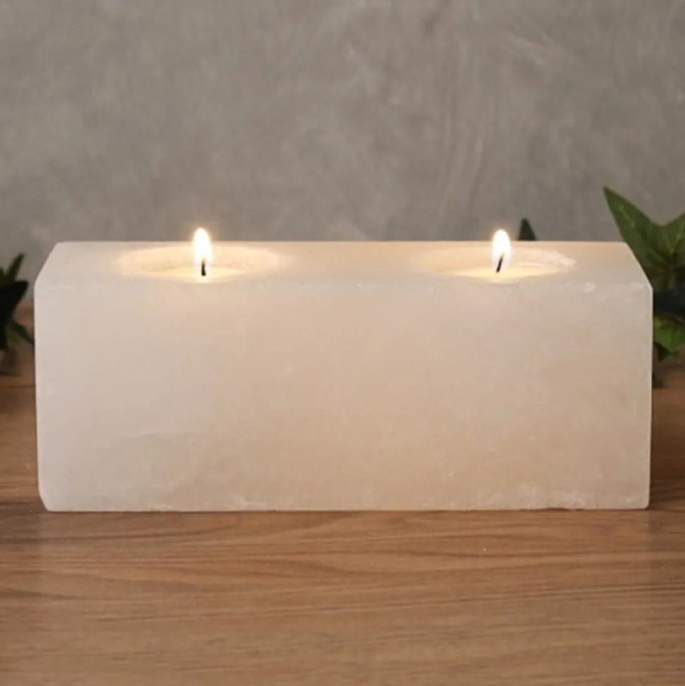 De rechthoekige theelichthouder Twin Cube White Line gemaakt van zeldzaam, wit kristalzout uit de buurt van het Himalaya-gebergte is een volledig nieuw type zoutkristallamp. Het biedt uitsparingen voor twee waxinelichtjes.