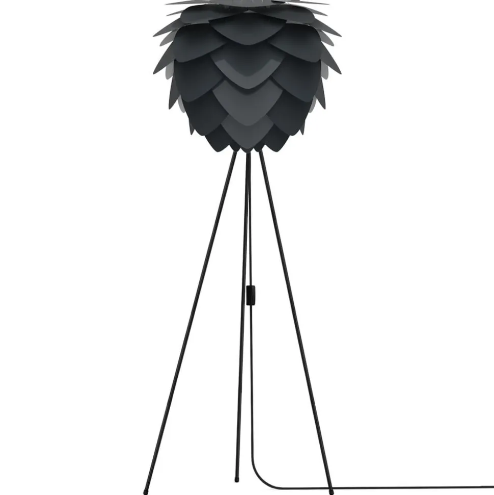 Antracietkleurige kap en zwart frame: driepoot vloerlamp Aluvia Twee ontwerpen van de Deense ontwerper Søren Ravn Christensen, creatief ontwikkelaar en medeoprichter van het verlichtingsbedrijf UMAGE, zijn hier gecombineerd tot een vloerlamp die qua esthetiek en functionaliteit ongeëvenaard is. De antracietkleurige kap Aluvia, die er dankzij het extravagante bladdesign uitziet als een exotische plant, troont op het Tripod driepootframe, dat gemaakt is van zwart gelakt aluminium. De vloerlamp Aluvia maakt echter niet alleen indruk met haar fascinerende uiterlijk, maar ook met haar fenomenale lichteffect, waardoor ze een uitstekende bron is voor sfeervolle accentverlichting.