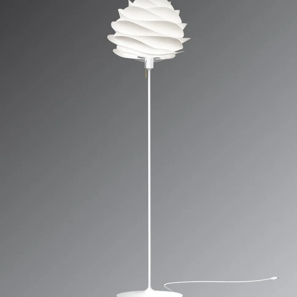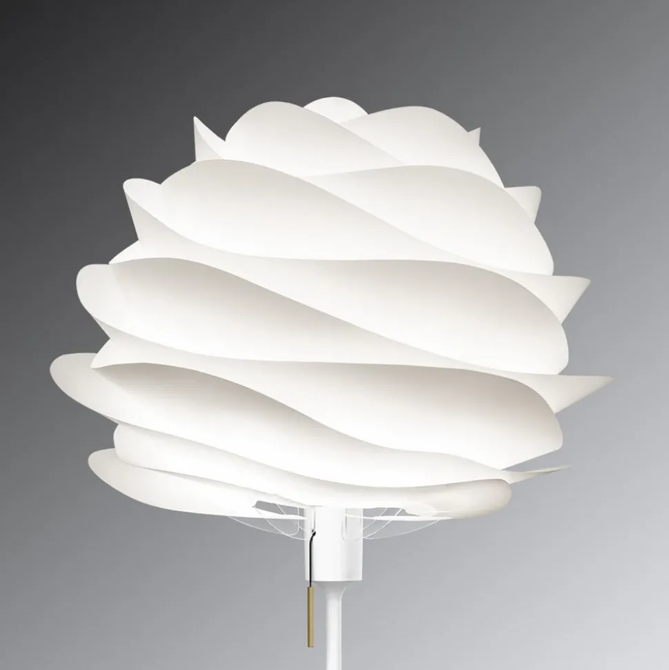 De onbreekbare kunststof kap van Carmina, die opvalt door haar zachte golfvorm en het daaruit voortvloeiende lichteffect, wordt aangevuld met een wit gelakt, slank metalen frame om een vloerlamp te creëren die met haar design overal indruk maakt.