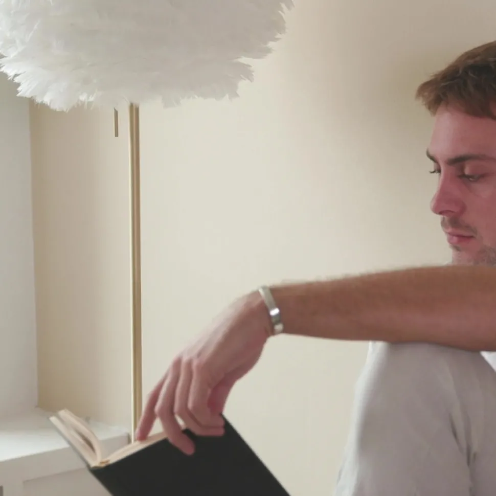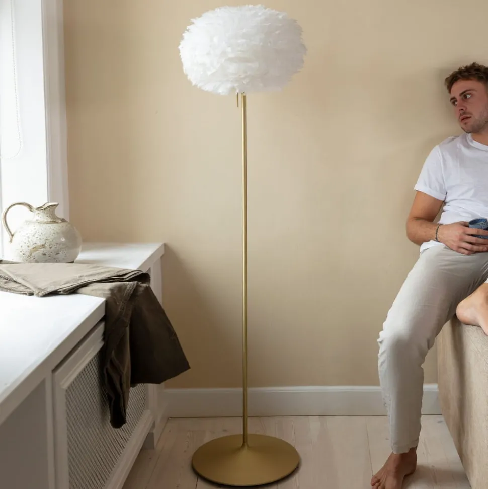 Deze vloerlamp is de geslaagde combinatie van designelementen van twee Deense ontwerpers. De lampenkap Eos medium is volledig gemaakt van echte ganzenveren, waarbij moet worden benadrukt dat er geen veren van levende dieren worden gebruikt. Het is een creatie van Søren Ravn Christensen, de medeoprichter en hoofdontwerper van het productiebedrijf UMAGE. Eos medium geeft het stralende licht een bijzonder effect dat op doorslaggevende wijze bijdraagt tot de gezelligheid in de kamer. Het edele messing frame van Anders Klem is de ideale aanvulling op Eos medium. Met zijn decoratieve vorm, die is gemodelleerd naar de steel van een champagneglas, doet hij qua elegantie in geen enkel opzicht onder voor de lampenkap. Een onverslaanbare combinatie die in elke kamer een blikvanger zal zijn.