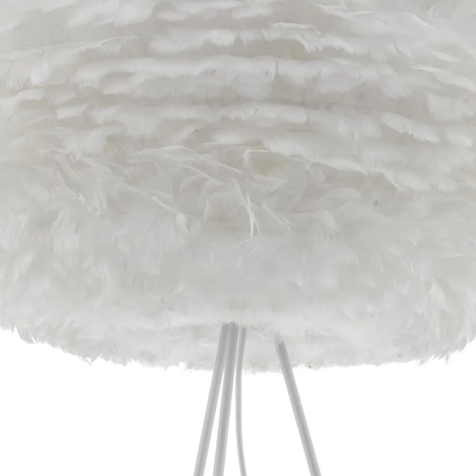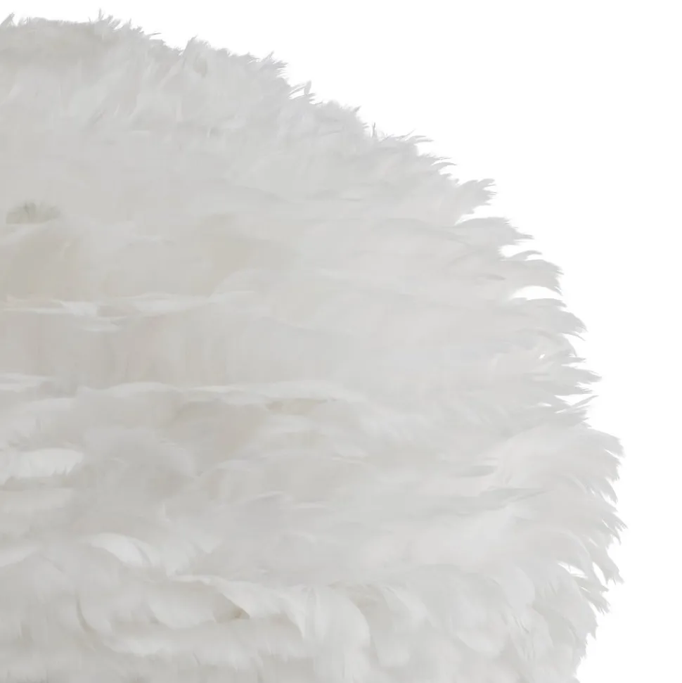 In het wit wordt de driepotige Eos X-large vloerlamp met zijn grote veerkap gepresenteerd. De kap is bedekt met ca. 6.000 echte ganzenveren, die niet alleen zacht en pluizig aanvoelen, maar ook het lichteffect zeer zacht maken. Søren Ravn Christensen, de ontwerper van Eos X-large, liet zich hier inspireren door de eenvoudige schoonheid van het Scandinavische design, dat met grote vanzelfsprekendheid fascineert.