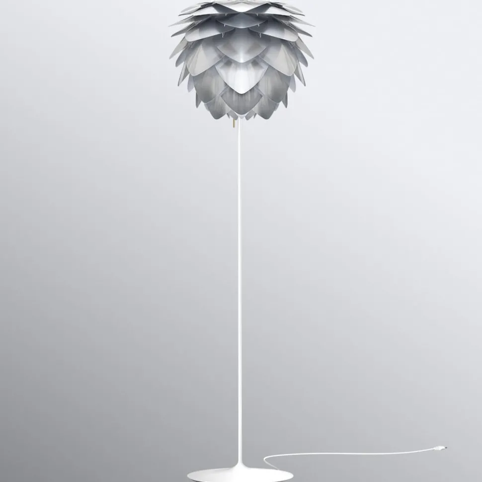 Bij de staande lamp Silvia medium valt in de eerste plaats één ding op: de organische structuur van de kap die bestaat uit een veelheid van bladvormige kunststof elementen. De driehoekige vorm van de afzonderlijke delen betekent ook dat het uitgestraalde licht niet alleen zijn weg vindt door de openingen aan de boven- en onderkant van de lampenkap, maar ook schijnt door de ruimten tussen de elementen die eruit zien als bladeren. Het resultaat is een fascinerende lichtsfeer die bijvoorbeeld kan worden gebruikt om de zithoek in de woonkamer zeer huiselijk te maken. Uitgerust met een decoratieve messing schakelaar.