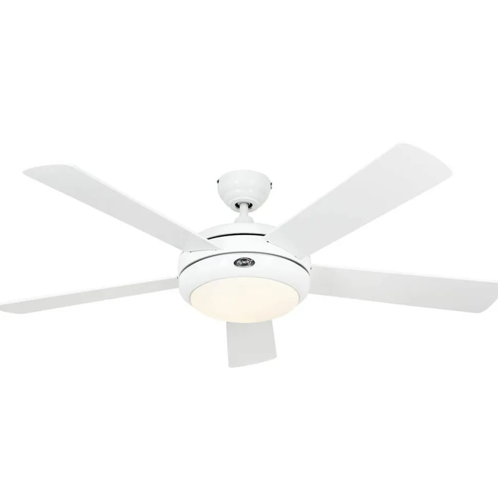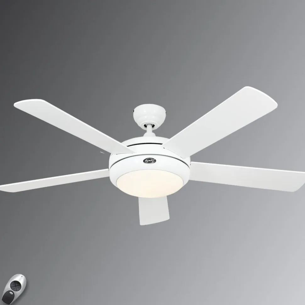 Witte Titanium plafondventilator met verlichting en praktische afstandsbedieningMet zijn moderne uitstraling, hoge luchtopbrengst en krachtige verlichting is de plafondventilator een praktische verlichtings-/ventilatieoplossing voor modern vormgegeven omgevingen, die hij ook als decoratief accessoire siert. FunctiesMet de meegeleverde radiografische afstandsbediening kan de motor in drie stappen en de verlichting (aan/uit en dimmen) worden geregeld.Titanium heeft ook een schuifschakelaar om te schakelen tussen vooruit en achteruit voor zomer- of winterwerking.Montage op schuine plafonds tot 14° is mogelijk.Technische gegevensVermogen: 9-66 wattSnelheid: max. 195 rpmBijzonderhedenDe ventilator wordt gekenmerkt door een absoluut stille werking en een gelijkmatige lichtverdeling door een hoogwaardig matglas. Hierdoor is hij bijzonder geschikt voor gebruik in hotels, restaurants en kantoren.