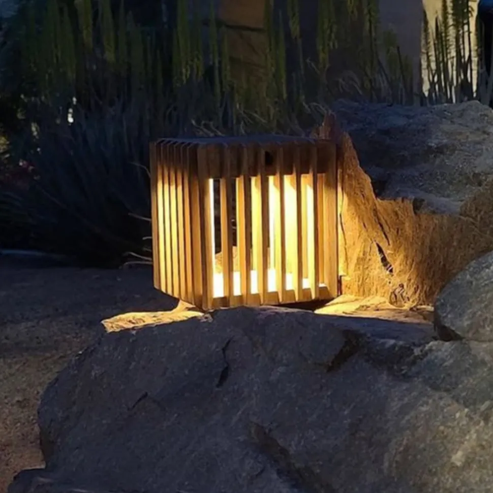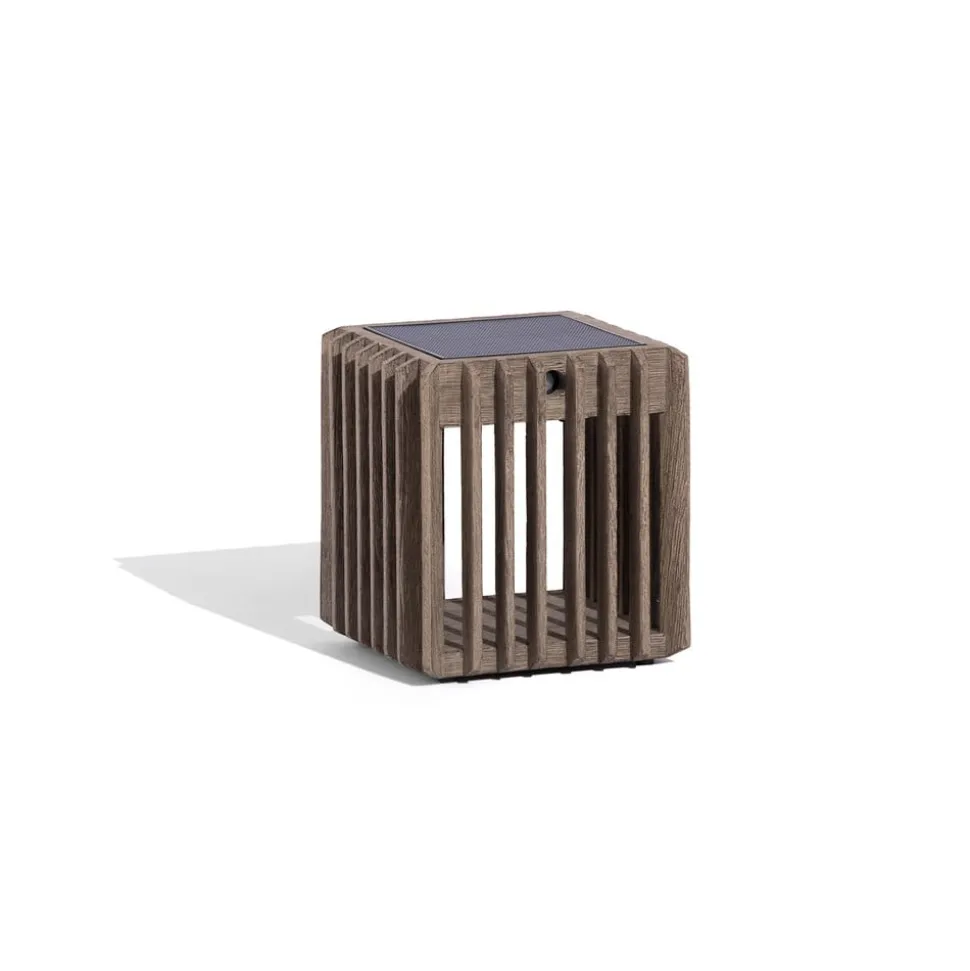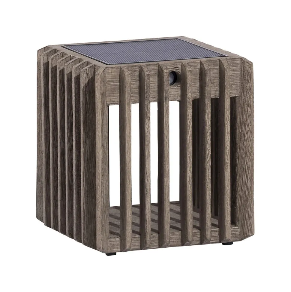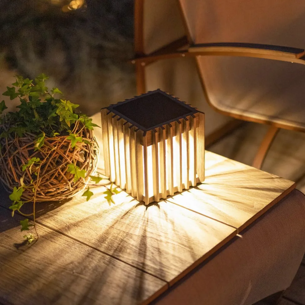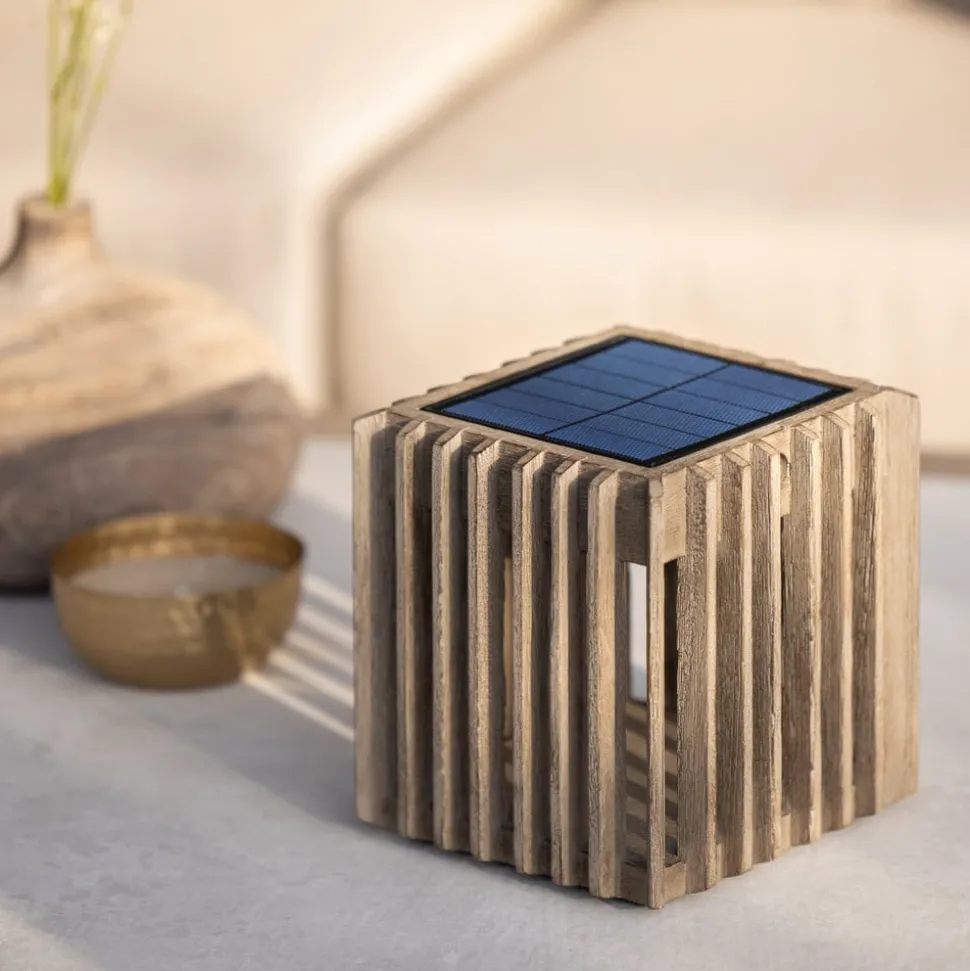 Kubusvormige Verti LED solar tafellamp van teakhout De Verti LED solar tafellamp heeft een hoekige vorm en is gemaakt van teakhout. Ze bestaat uit talrijke stokjes waar het licht van de warmwitte LED’s doorheen schijnt en zo een sfeervol patroon creëert. Dankzij de compacte afmetingen en het autonome gebruik kan de lamp op elke tafel worden geplaatst en flexibel buiten worden gebruikt. Via de geïntegreerde zonnemodule kunnen twee verschillende modi worden geselecteerd: in de eerste modus controleert het systeem constant drie parameters: het stroomverbruik, de energiereserve en de donkertijd. De helderheid van de lamp wordt dan overeenkomstig aangepast zodat de lamp de hele nacht kan branden. Er wordt voor meer helderheid gezorgd aan het begin van de donkere periode en aan het einde van de nacht. In de tweede modus blijft de lamp permanent ingeschakeld op volle helderheid. De lichtintensiteit kan individueel worden aangepast door de aan/uit-knop ingedrukt te houden – Lichtduur tussen 4-150 uur
