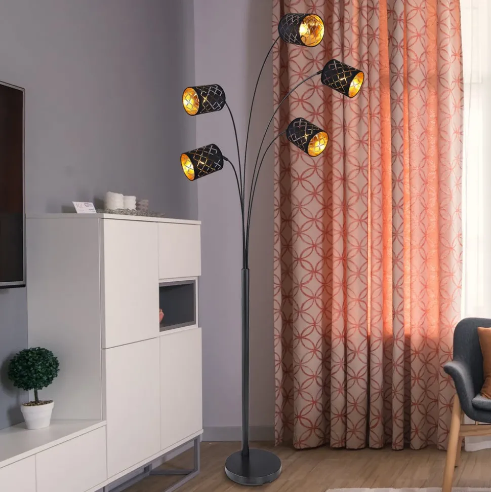 Vijflamps vloerlamp Clarke in zwart gelakt ijzer en stoffen kappen met gouden accenten