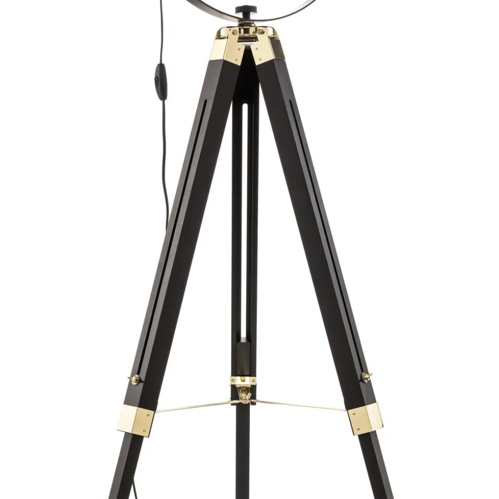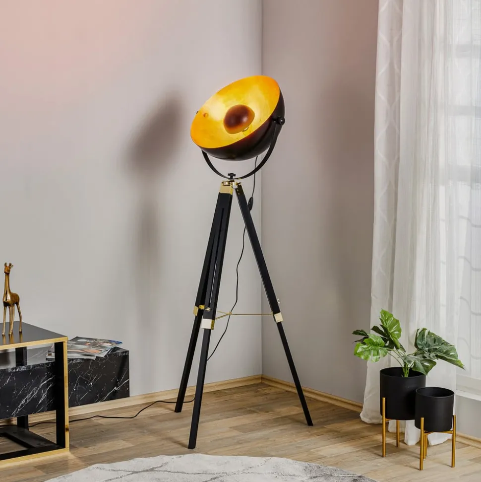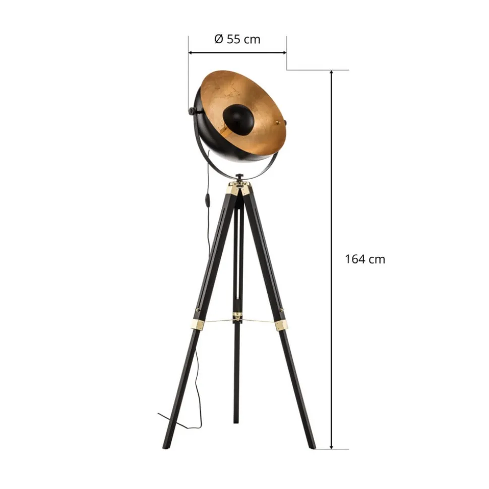 Het driepoots-frame van de Covaleda vloerlamp is gemaakt van hout en is ontworpen als een driepoot. Goudkleurige metalen details in de vorm van eindkappen, verstevigingen en vleugelschroeven voor de bevestiging vormen een trendy contrast met het zwart van het hout. De kap in de vorm van een halve bol van metaal, die in een beugel zit en naar binnen kan worden gezwenkt, is ook zwart aan de buitenkant en goud aan de binnenkant, zodat het licht een bijzonder warme noot krijgt. Een metalen element schermt de lichtbron naar voren af, zodat er geen verblinding is wanneer de armatuur direct wordt bekeken.
