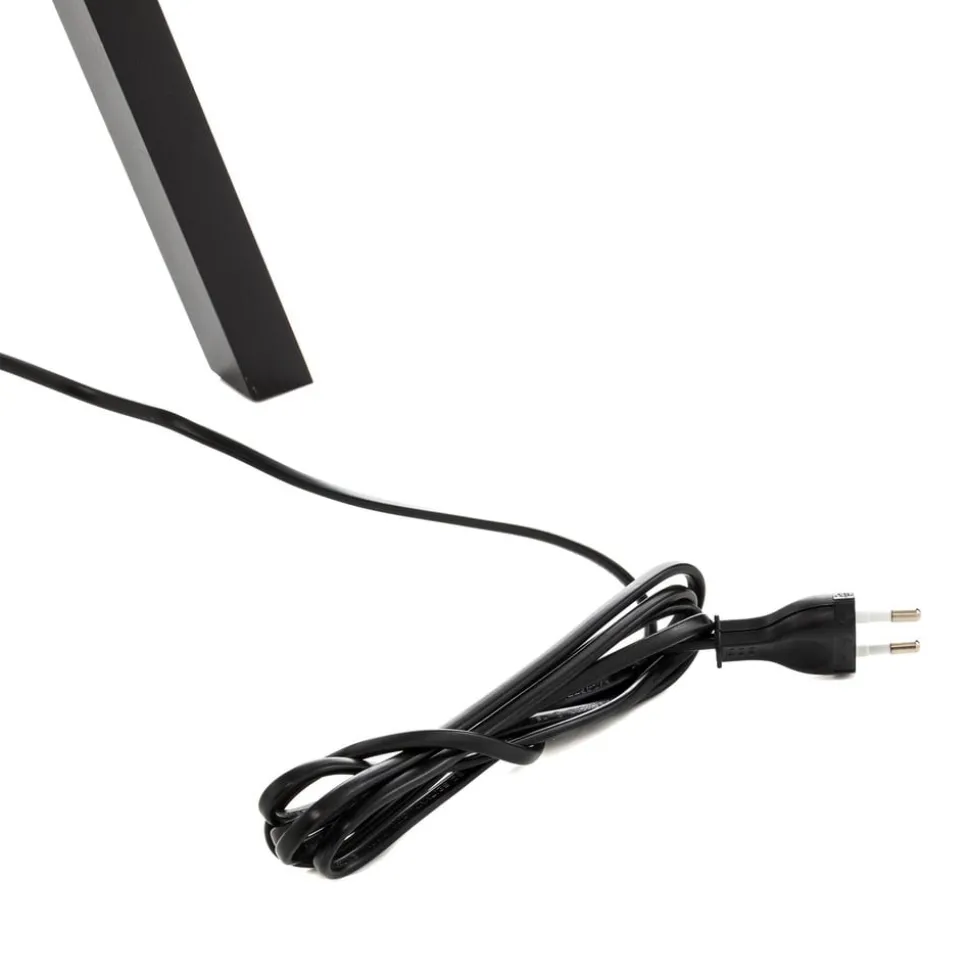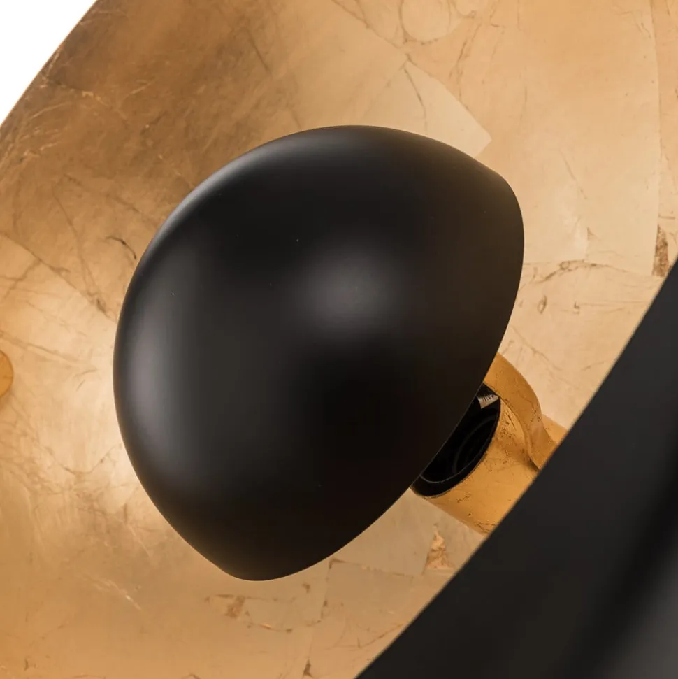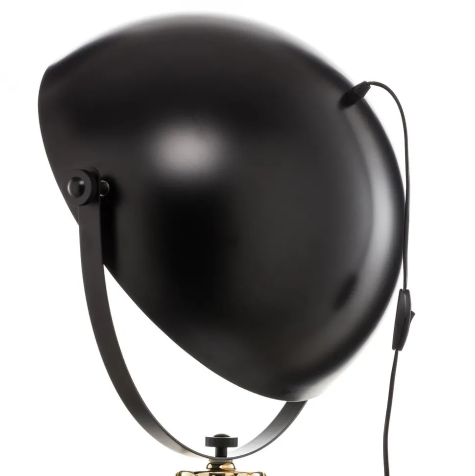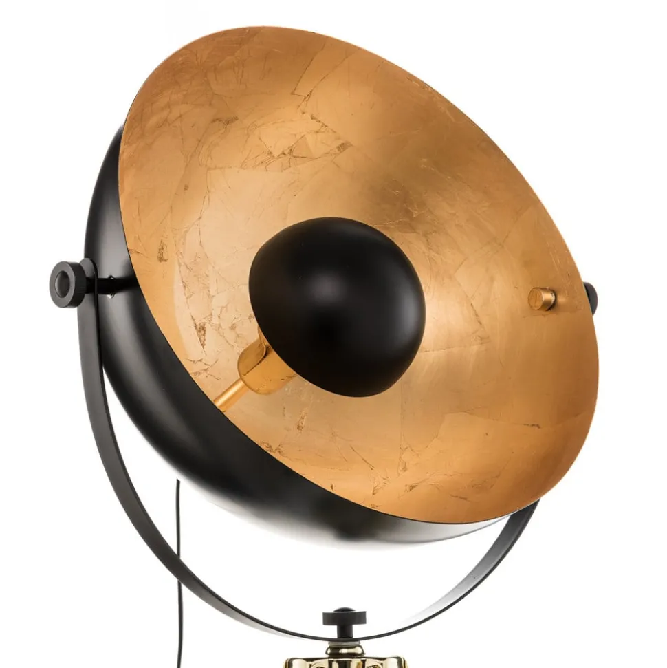 Het driepoots-frame van de Covaleda vloerlamp is gemaakt van hout en is ontworpen als een driepoot. Goudkleurige metalen details in de vorm van eindkappen, verstevigingen en vleugelschroeven voor de bevestiging vormen een trendy contrast met het zwart van het hout. De kap in de vorm van een halve bol van metaal, die in een beugel zit en naar binnen kan worden gezwenkt, is ook zwart aan de buitenkant en goud aan de binnenkant, zodat het licht een bijzonder warme noot krijgt. Een metalen element schermt de lichtbron naar voren af, zodat er geen verblinding is wanneer de armatuur direct wordt bekeken.