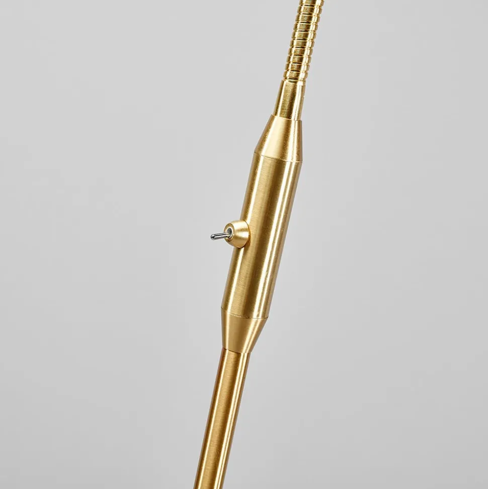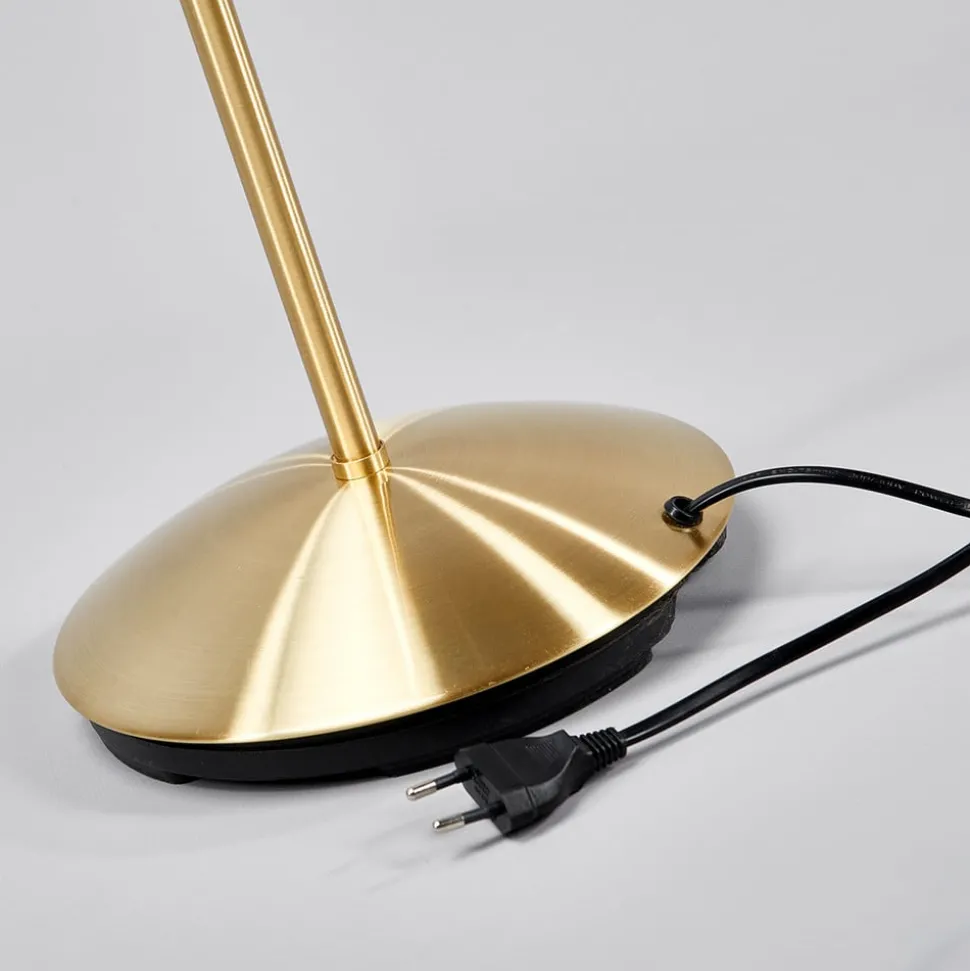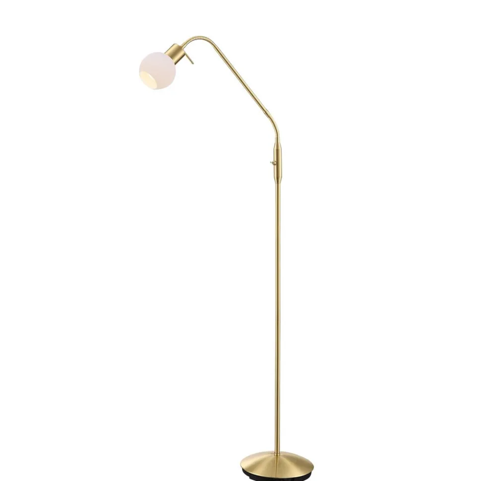 Discrete vloerlamp Elaina met messingkleurig oppervlak Deze vloerlamp is een prachtige aanwinst voor de woonkamer, waar hij kan worden gebruikt als uitstekende leesverlichting. Voor dit doel kan hij naast een bank worden geplaatst en worden ingeschakeld als er extra, helder licht nodig is, zodat je kunt ontspannen en door je favoriete boek kunt bladeren. De lampenkop van wit glas heeft een compact ontwerp en heeft de vorm van een bol met een kleine opening aan de voorkant. Dankzij twee flexibele scharnieren – één onder de lampenkop, de andere boven het midden van het frame – kan het licht optimaal worden gericht. De schakelaar bevindt zich ook in het midden van het frame, iets onder het tweede flexibele scharnier, en kan snel worden bediend, zelfs als je het jezelf al comfortabel hebt gemaakt op de bank.