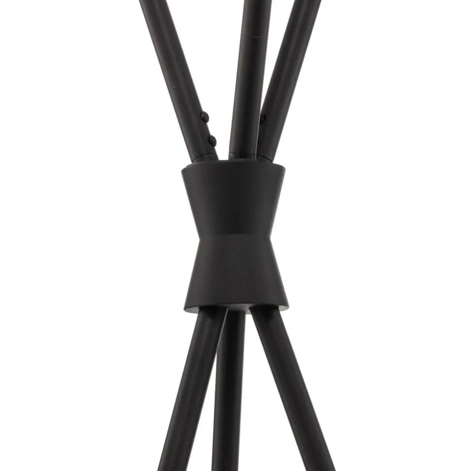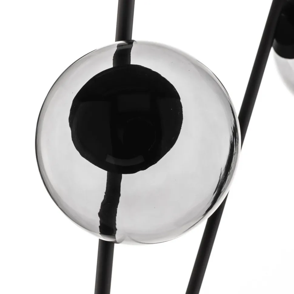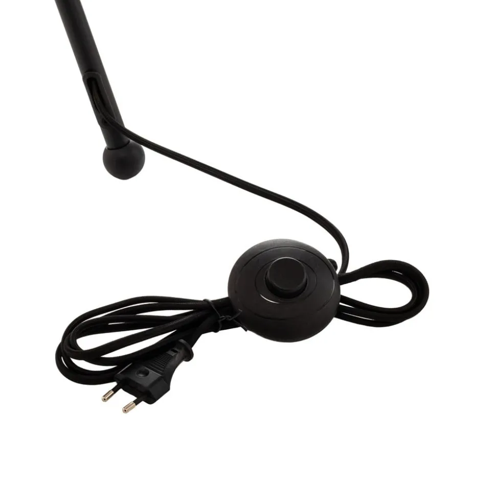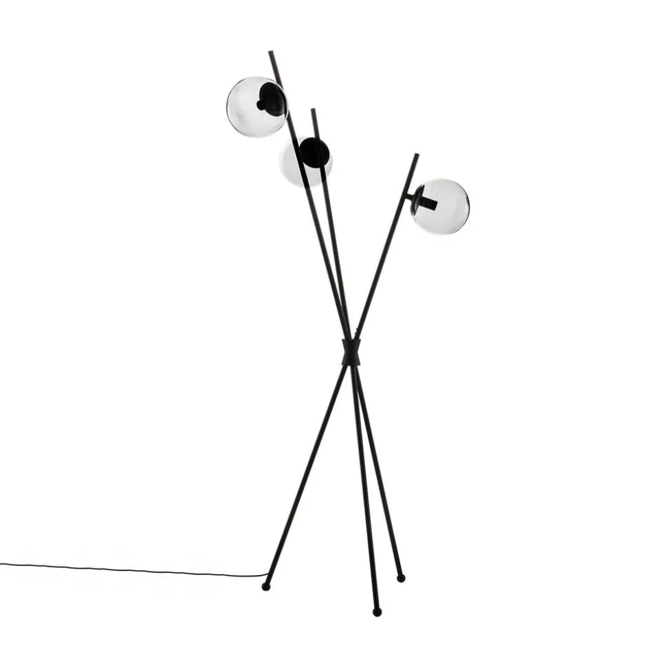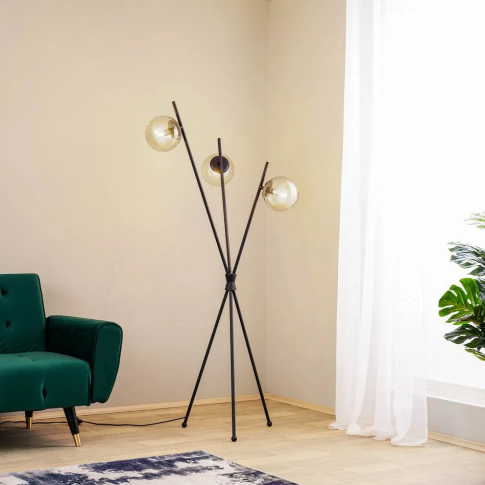 Driepotige design vloerlamp Sotiana met zwart frame en drie glazen bollen in rookgrijs Sotiana maakt indruk met een opvallende en individuele look en is een vloerlamp op drie poten die is vervaardigd volgens designnormen. Het driepotige frame van zwart ijzer lijkt in het midden te zijn samengebald en wijkt dan aan de bovenkant iets af om over te gaan in de kappen van gerookt glas. Dit zorgt niet alleen voor een zekere dynamiek, maar ook voor een designgerichte uitstraling. De bolvormige glazen kappen met hun rookgrijze tint verfijnen ook het lichtbeeld en laten altijd een doorkijkje toe naar de binnenkant van het glas, waar zich de zwarte fitting bevindt. De gebruikte lampen maken daarom altijd deel uit van de totale look en moeten worden gekozen om een harmonieus uiterlijk te creëren. LED filament lampen zijn bijzonder aantrekkelijk en worden aanbevolen omdat ze lijken op klassieke gloeilampen en toch veel minder elektriciteit verbruiken. De stekker kabel is bekleed met textiel en past daarom heel goed bij het elegante algemene ontwerp, dat rechte lijnen combineert met een vleugje luxe.