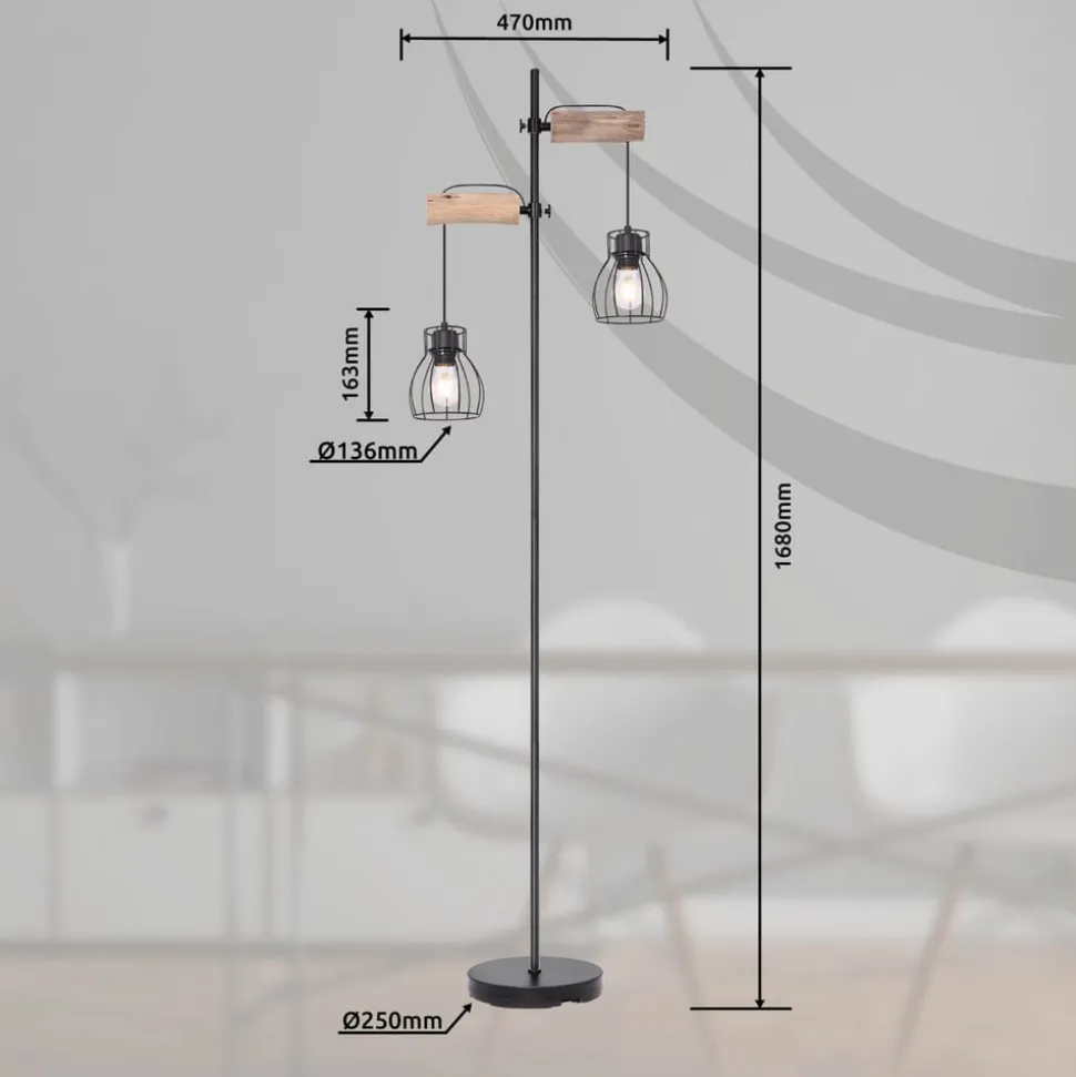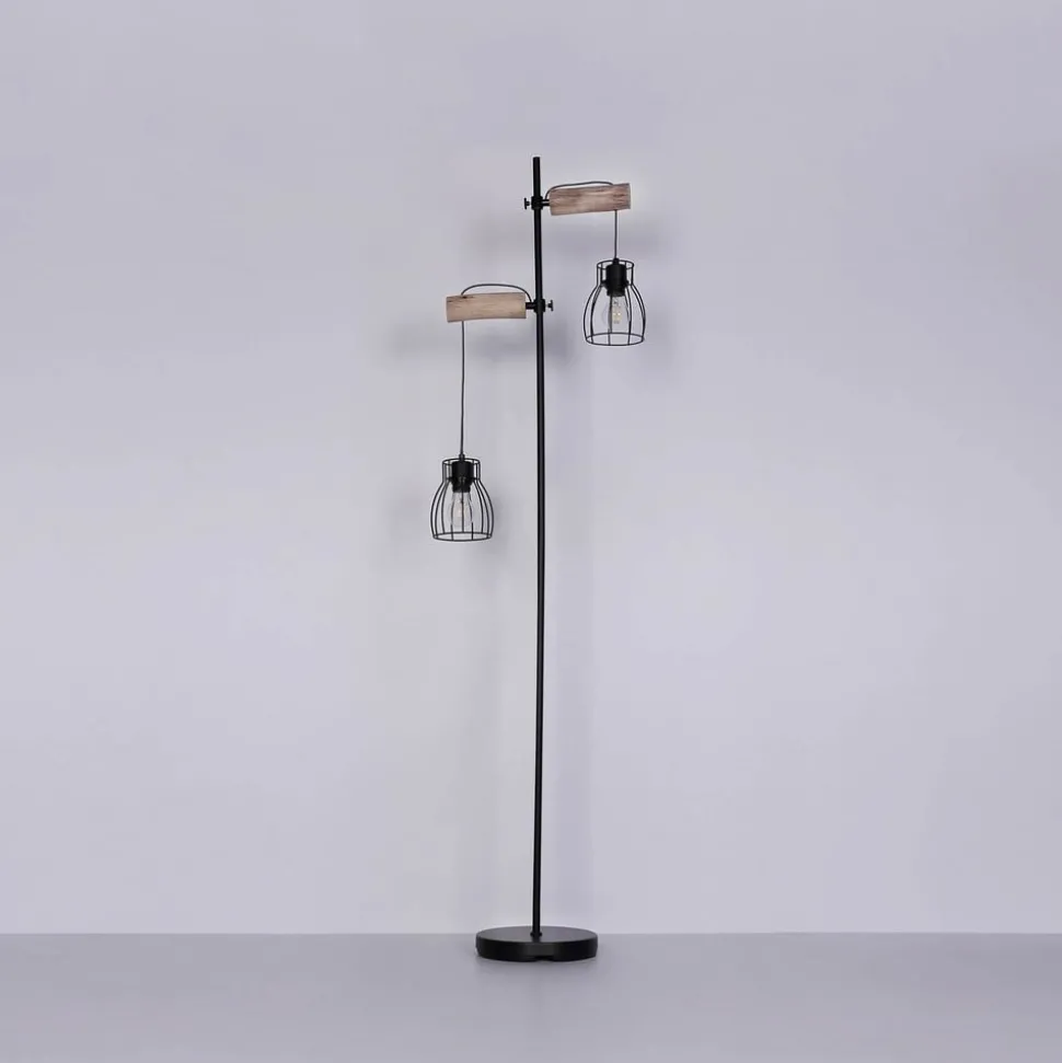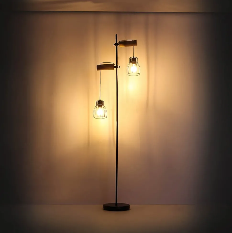 Vloerlamp Mina met houten details en kooikappen De tweelamps vloerlamp Mina maakt indruk met haar eenvoudige, vrij onopvallende ontwerp. De lamp is gemaakt van metaal en heeft een aan/uit-schakelaar. Dankzij de twee E27 fittingen met een maximum van 40W per fitting kun je zelf de juiste lamp kiezen. LED lampen worden aanbevolen vanwege hun energiebesparing en lange levensduur.